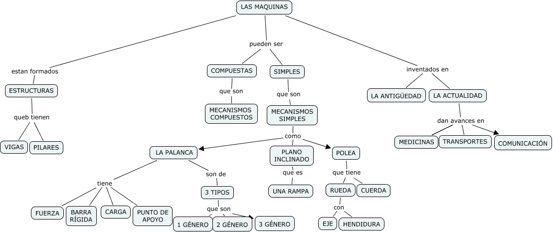 Este Cmap, tiene información relacionada con: LAS MÁQUINAS (Gabriel y David), LA PALANCA tiene BARRA RÍGIDA, POLEA que tiene CUERDA, LA ACTUALIDAD dan avances en MEDICINAS, 3 TIPOS que son 2 GÉNERO, LAS MAQUINAS pueden ser SIMPLES, MECANISMOS SIMPLES como LA PALANCA, RUEDA con EJE, LAS MAQUINAS inventados en LA ANTIGÜEDAD, SIMPLES que son MECANISMOS SIMPLES, LA PALANCA tiene FUERZA, 3 TIPOS que son 1 GÉNERO, ESTRUCTURAS queb tienen PILARES, LA ACTUALIDAD dan avances en TRANSPORTES, MECANISMOS SIMPLES como PLANO INCLINADO, PLANO INCLINADO que es UNA RAMPA, LA ACTUALIDAD dan avances en MEDICINAS, LA PALANCA tiene PUNTO DE APOYO, ESTRUCTURAS queb tienen VIGAS, RUEDA con HENDIDURA, POLEA que tiene RUEDA