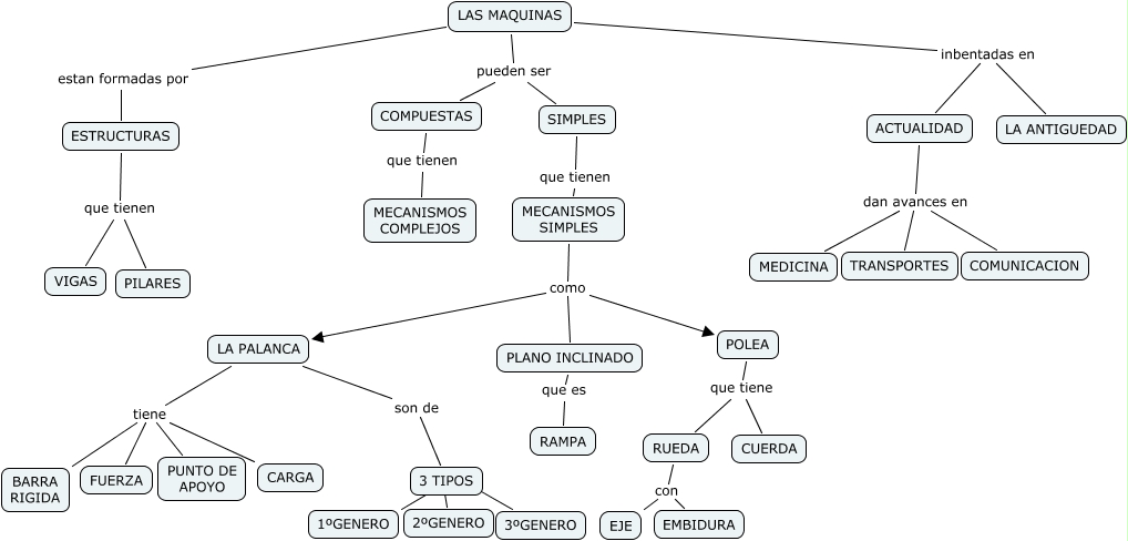 Este Cmap, tiene información relacionada con: LAS MÁQUINAS (Daniela y Lucas), LAS MAQUINAS inbentadas en LA ANTIGUEDAD, POLEA que tiene CUERDA, 3 TIPOS ???? 2ºGENERO, ACTUALIDAD dan avances en TRANSPORTES, LA PALANCA tiene FUERZA, SIMPLES que tienen MECANISMOS SIMPLES, MECANISMOS SIMPLES como POLEA, POLEA que tiene RUEDA, LAS MAQUINAS pueden ser COMPUESTAS, MECANISMOS SIMPLES como PLANO INCLINADO, LA PALANCA tiene CARGA, ESTRUCTURAS que tienen VIGAS, 3 TIPOS ???? 3ºGENERO, RUEDA con EJE, LAS MAQUINAS estan formadas por ESTRUCTURAS, LAS MAQUINAS pueden ser SIMPLES, LAS MAQUINAS inbentadas en ACTUALIDAD, LA PALANCA tiene BARRA RIGIDA, RUEDA con EMBIDURA, 3 TIPOS ???? 1ºGENERO