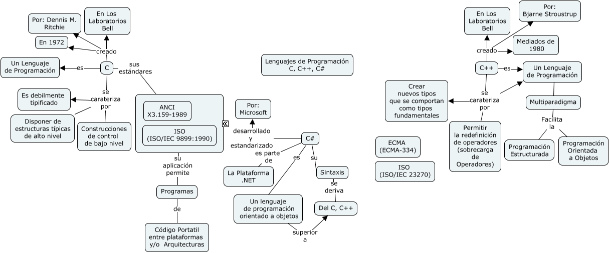 Este Cmap, tiene información relacionada con: Lenguajes de Programacion C y su evolución, C++ creado En Los Laboratorios Bell, Programas de Código Portatil entre plataformas y/o Arquitecturas, C sus estándares ????, Un lenguaje de programación orientado a objetos superior a Del C, C++, Multiparadigma Facilita la Programación Estructurada, C# su Sintaxis, C++ creado Mediados de 1980, ???? su aplicación permite Programas, C creado En Los Laboratorios Bell, C creado En 1972, C++ se carateriza por Permitir la redefinición de operadores (sobrecarga de Operadores), C# es Un lenguaje de programación orientado a objetos, C se carateriza por Es debilmente tipificado, C creado Por: Dennis M. Ritchie, Sintaxis se deriva Del C, C++, C++ se carateriza por Crear nuevos tipos que se comportan como tipos fundamentales, C se carateriza por Construcciones de control de bajo nivel, C++ creado Por: Bjarne Stroustrup, C es Un Lenguaje de Programación, Multiparadigma Facilita la Programación Orientada a Objetos