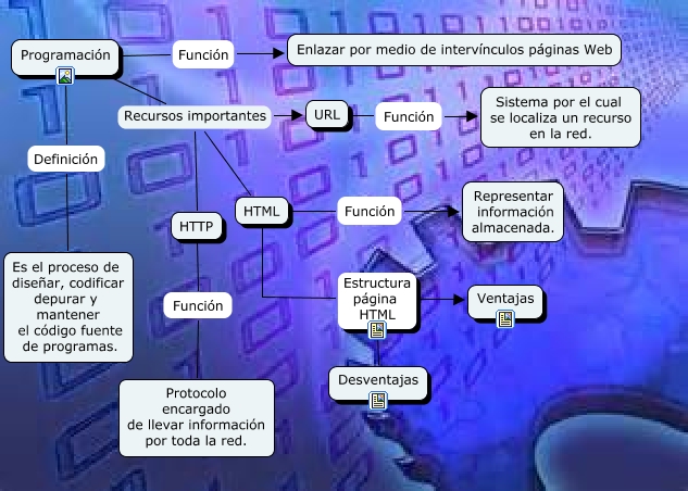 Este Cmap, tiene información relacionada con: Programación, Programación Recursos importantes HTML, URL Función Sistema por el cual se localiza un recurso en la red., Programación Recursos importantes HTTP, Programación Definición Es el proceso de diseñar, codificar depurar y mantener el código fuente de programas., Programación Función Enlazar por medio de intervínculos páginas Web, HTML Función Representar información almacenada., Programación Recursos importantes URL, HTML Estructura página HTML Desventajas, HTTP Función Protocolo encargado de llevar información por toda la red., HTML Estructura página HTML Ventajas