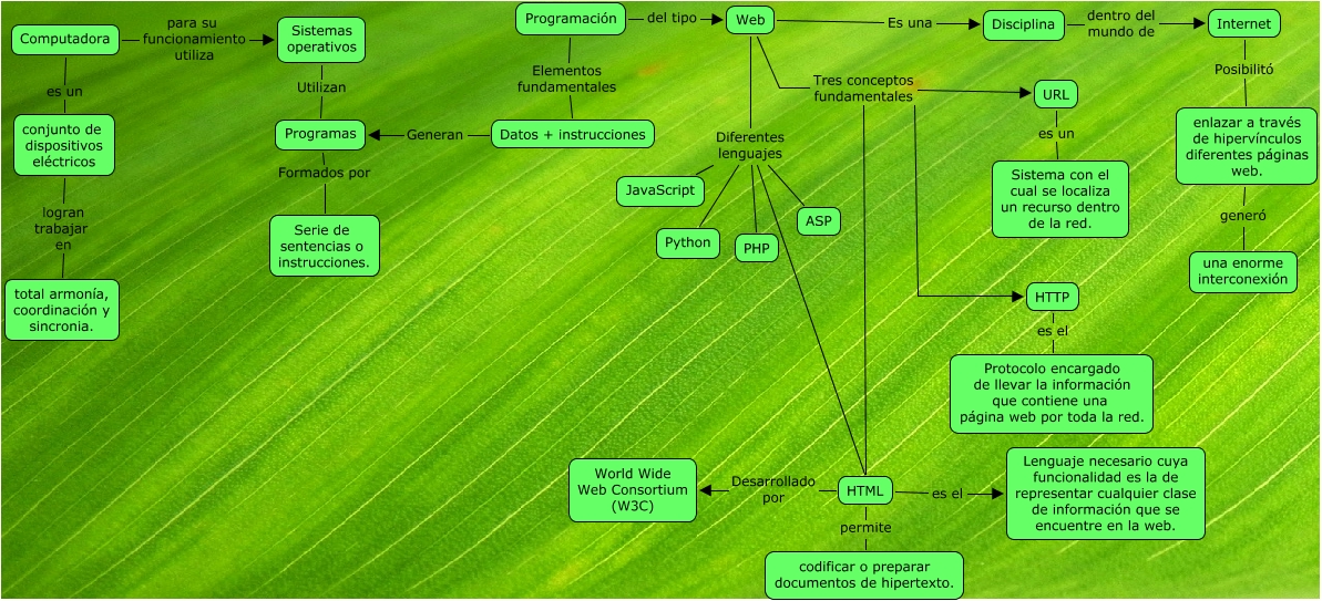 Este Cmap, tiene información relacionada con: programacion web, Disciplina dentro del mundo de Internet, Web Tres conceptos fundamentales HTML, Web Es una Disciplina, Web Tres conceptos fundamentales HTTP, Web Diferentes lenguajes PHP, conjunto de dispositivos eléctricos logran trabajar en total armonía, coordinación y sincronia., URL es un Sistema con el cual se localiza un recurso dentro de la red., Computadora es un conjunto de dispositivos eléctricos, HTML permite codificar o preparar documentos de hipertexto., Web Tres conceptos fundamentales URL, Web Diferentes lenguajes JavaScript, Sistemas operativos Utilizan Programas, HTML es el Lenguaje necesario cuya funcionalidad es la de representar cualquier clase de información que se encuentre en la web., HTML Desarrollado por World Wide Web Consortium (W3C), enlazar a través de hipervínculos diferentes páginas web. generó una enorme interconexión, Programación Elementos fundamentales Datos + instrucciones, Web Diferentes lenguajes Python, Web Diferentes lenguajes HTML, Internet Posibilitó enlazar a través de hipervínculos diferentes páginas web., Web Diferentes lenguajes ASP