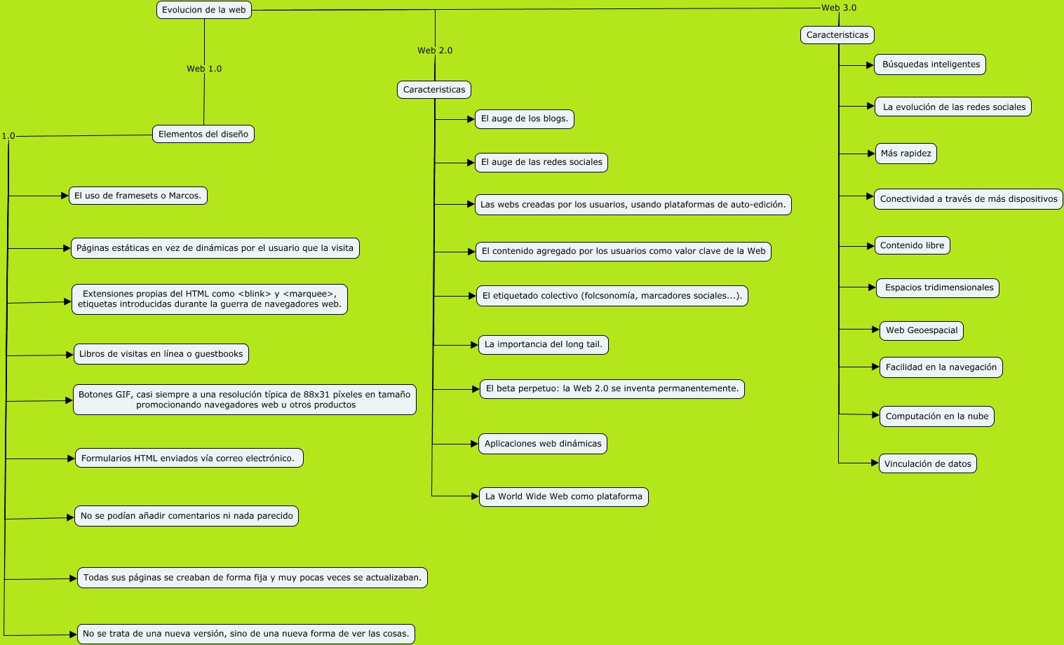 Este Cmap, tiene información relacionada con: evolucion web, Evolucion de la web Web 2.0 El auge de los blogs., Evolucion de la web Web 3.0 Vinculación de datos, Evolucion de la web Web 3.0 Web Geoespacial, Evolucion de la web Web 2.0 La World Wide Web como plataforma, Evolucion de la web Web 3.0 Facilidad en la navegación, Elementos del diseño 1.0 Libros de visitas en línea o guestbooks, Elementos del diseño 1.0 El uso de framesets o Marcos., Evolucion de la web Web 3.0 Búsquedas inteligentes, Evolucion de la web Web 1.0 Elementos del diseño, Evolucion de la web Web 2.0 Las webs creadas por los usuarios, usando plataformas de auto-edición., Elementos del diseño 1.0 Todas sus páginas se creaban de forma fija y muy pocas veces se actualizaban., Evolucion de la web Web 3.0 Espacios tridimensionales, Elementos del diseño 1.0 No se podían añadir comentarios ni nada parecido, Evolucion de la web Web 3.0 La evolución de las redes sociales, Evolucion de la web Web 2.0 El auge de las redes sociales, Evolucion de la web Web 2.0 Aplicaciones web dinámicas, Evolucion de la web Web 2.0 El etiquetado colectivo (folcsonomía, marcadores sociales...)., Evolucion de la web Web 2.0 Caracteristicas, Evolucion de la web Web 3.0 Computación en la nube, Evolucion de la web Web 2.0 El beta perpetuo: la Web 2.0 se inventa permanentemente.