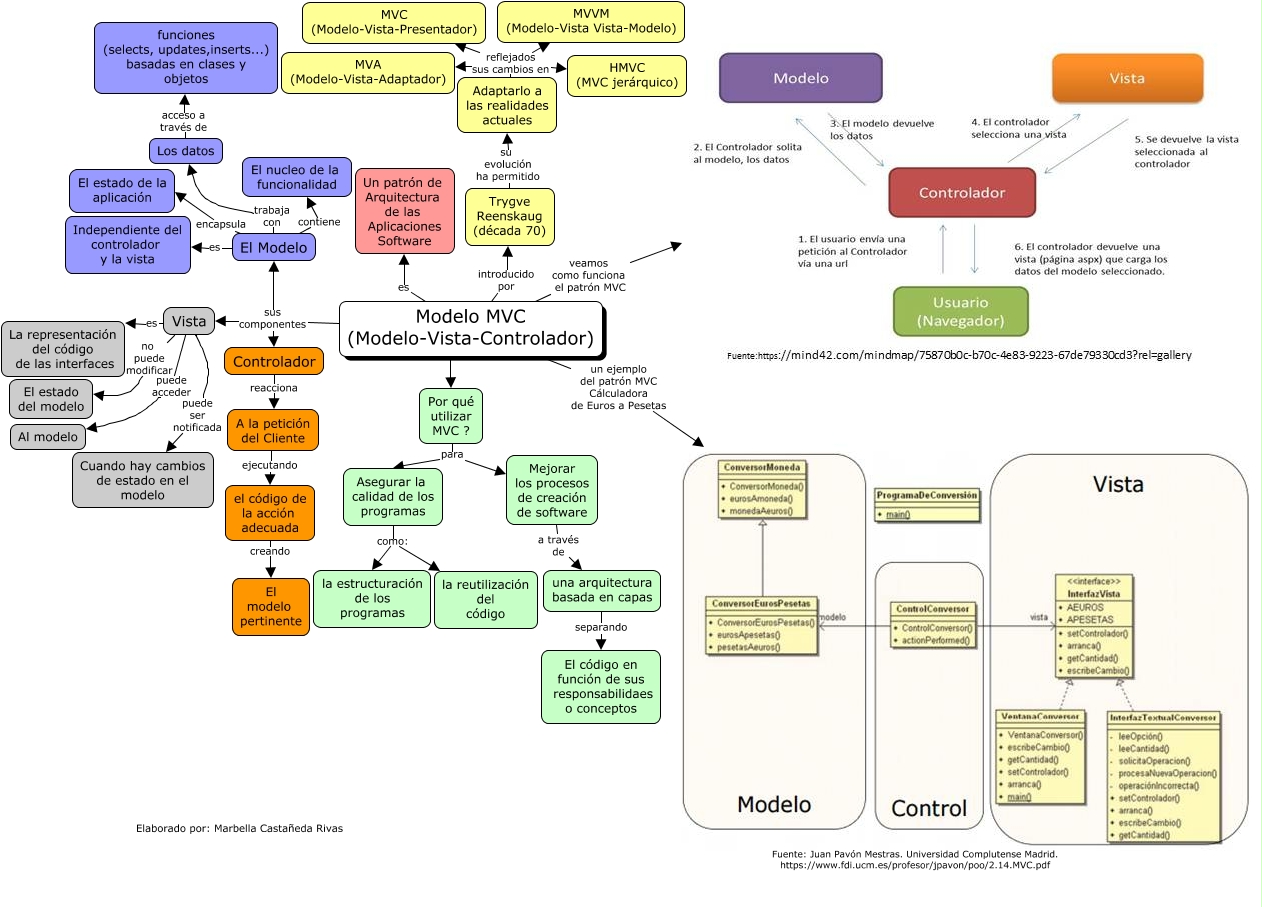 Este Cmap, tiene información relacionada con: Modelo-Vista-Controlador, Adaptarlo a las realidades actuales reflejados sus cambios en MVA (Modelo-Vista-Adaptador), A la petición del Cliente ejecutando el código de la acción adecuada, Por qué utilizar MVC ? para Mejorar los procesos de creación de software, El Modelo contiene El nucleo de la funcionalidad, Adaptarlo a las realidades actuales reflejados sus cambios en MVVM (Modelo-Vista Vista-Modelo), Los datos acceso a través de funciones (selects, updates,inserts...) basadas en clases y objetos, El Modelo encapsula El estado de la aplicación, Modelo MVC (Modelo-Vista-Controlador) un ejemplo del patrón MVC Cálculadora de Euros a Pesetas, Adaptarlo a las realidades actuales reflejados sus cambios en HMVC (MVC jerárquico), Modelo MVC (Modelo-Vista-Controlador) Por qué utilizar MVC ?, Asegurar la calidad de los programas como: la estructuración de los programas, Modelo MVC (Modelo-Vista-Controlador) veamos como funciona el patrón MVC, El Modelo es Independiente del controlador y la vista, El Modelo trabaja con Los datos, Vista es La representación del código de las interfaces, Modelo MVC (Modelo-Vista-Controlador) sus componentes Controlador, Modelo MVC (Modelo-Vista-Controlador) sus componentes El Modelo, una arquitectura basada en capas separando El código en función de sus responsabilidaes o conceptos, Adaptarlo a las realidades actuales reflejados sus cambios en MVC (Modelo-Vista-Presentador), el código de la acción adecuada creando El modelo pertinente