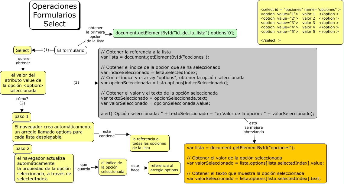 Este Cmap, tiene información relacionada con: operaciones formularios select, el navegador actualiza automáticamente la propiedad de la opción seleccionada, a través de selectedIndex. que guarda el indice de la opción seleccionada, El formulario obtener la primera opción de la lista document.getElementById("id_de_la_lista").options[0];, el indice de la opción seleccionada este hace referencia al arreglo options, // Obtener la referencia a la lista var lista = document.getElementById("opciones"); // Obtener el índice de la opción que se ha seleccionado var indiceSeleccionado = lista.selectedIndex; // Con el índice y el array "options", obtener la opción seleccionada var opcionSeleccionada = lista.options[indiceSeleccionado]; // Obtener el valor y el texto de la opción seleccionada var textoSeleccionado = opcionSeleccionada.text; var valorSeleccionado = opcionSeleccionada.value; alert("Opción seleccionada: " + textoSeleccionado + "\n Valor de la opción: " + valorSeleccionado); esto se mejora abreviando var lista = document.getElementById("opciones"); // Obtener el valor de la opción seleccionada var valorSeleccionado = lista.options[lista.selectedIndex].value; // Obtener el texto que muestra la opción seleccionada var valorSeleccionado = lista.options[lista.selectedIndex].text;, el valor del atributo value de la opción <option> seleccionada cómo? (2) paso 1, Select quiere obtener el valor del atributo value de la opción <option> seleccionada, El navegador crea automáticamente un arreglo llamado options para cada lista desplegable este contiene la referencia a todas las opciones de la lista, el valor del atributo value de la opción <option> seleccionada (3) // Obtener la referencia a la lista var lista = document.getElementById("opciones"); // Obtener el índice de la opción que se ha seleccionado var indiceSeleccionado = lista.selectedIndex; // Con el índice y el array "options", obtener la opción seleccionada var opcionSeleccionada = lista.options[indiceSeleccionado]; // Obtener el valor y el texto de la opción seleccionada var textoSeleccionado = opcionSeleccionada.text; var valorSeleccionado = opcionSeleccionada.value; alert("Opción seleccionada: " + textoSeleccionado + "\n Valor de la opción: " + valorSeleccionado);, El formulario (1) Select