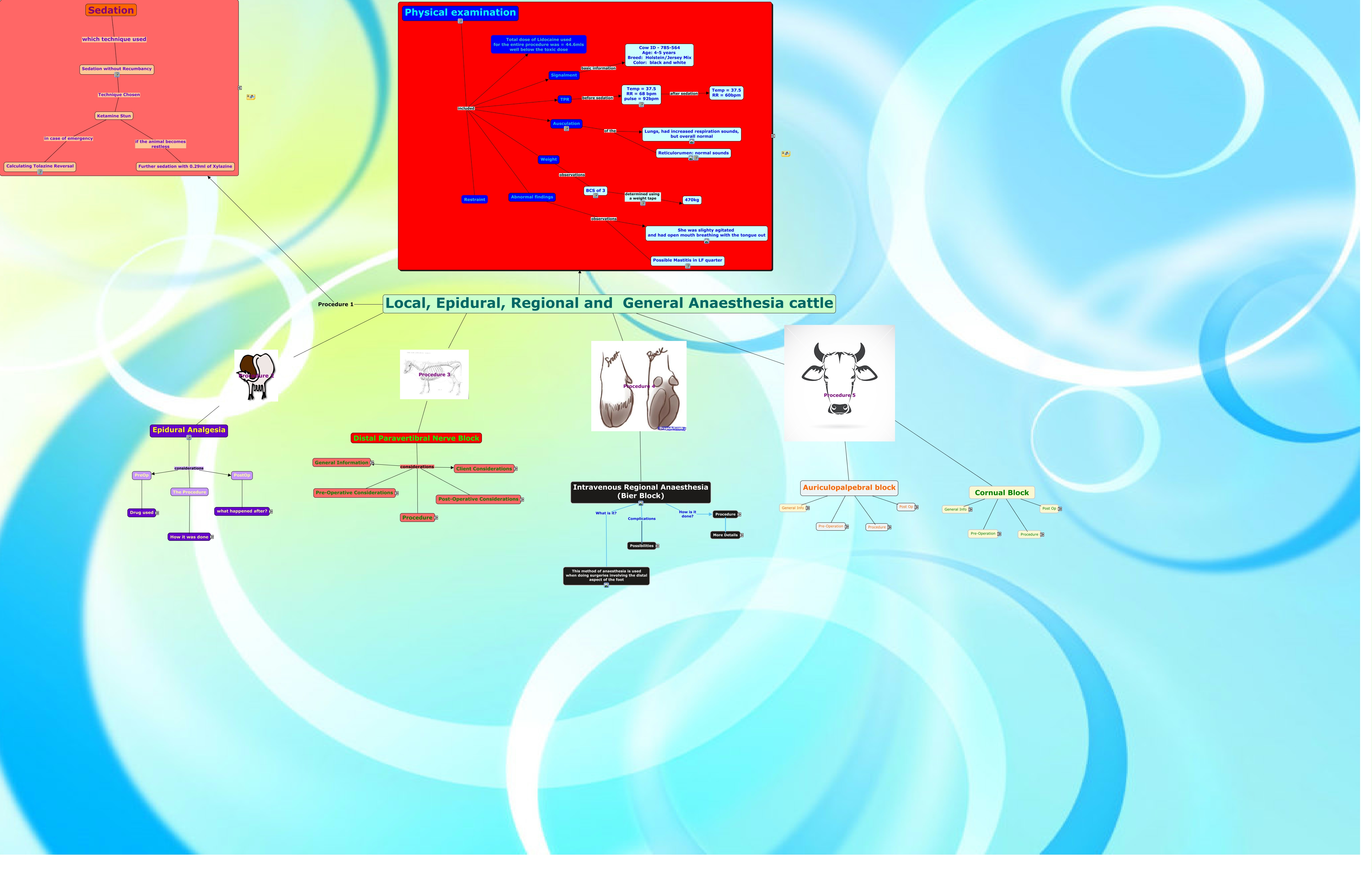 This Concept Map, created with IHMC CmapTools, has information related to: Local, Epirdural, Regional and General Anaesthesia of Cattle - final, Intravenous Regional Anaesthesia (Bier Block) Complications Dorsal digital veins are hard to access, Epidural Analgesia considerations PreOp, 10mg/Kg (10x470)/20, Distal Paravertibral Nerve Block considerations Procedure, Physical examination included Weight, sliding finger along the zygomatic arch, injecting half way, dorsocaudal of the arch confirmation of block by inability to blink, Injection landmarks how to give injection Epidural block, 2% Lidocaine was given in a 1:1 ratio lidocaine:saline, Auriculopalpebral block ???? Pre-Operation, Physical examination included Abnormal findings, Epidural Analgesia considerations PostOp, zygomaticotemporal nerve is a sensory nerve supple to the cornual process, Tourniquet was tied and the anaesthetic administered IV Why is a tourniquet used? The tourniquet must be tied tightly around the leg to prevent the flow of blood., Local, Epidural, Regional and General Anaesthesia cattle Procedure 2 Epidural Analgesia, the patient regained blinking time to regain reflex 33 minutes, zygomaticotemporal nerve which is a branch of trigeminal nerve, Physical examination included Ausculation, Post-Operative Considerations Food Saftey Drug Withdrawel Times, Ketamine Stun in case of adverse reactions Calculating Tolazine Reversal, Intravenous Regional Anaesthesia (Bier Block) What is it? This method of anaesthesia is used when doing surgeries involving the distal aspect of the foot