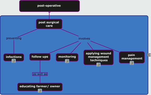 This Concept Map, created with IHMC CmapTools, has information related to: post op, follow ups as well as educating farmer/ owner, post surgical care involves applying wound management techniques, post surgical care involves follow ups, post surgical care involves monitoring, post surgical care preventing infections, post-operative post surgical care, post surgical care involves pain management