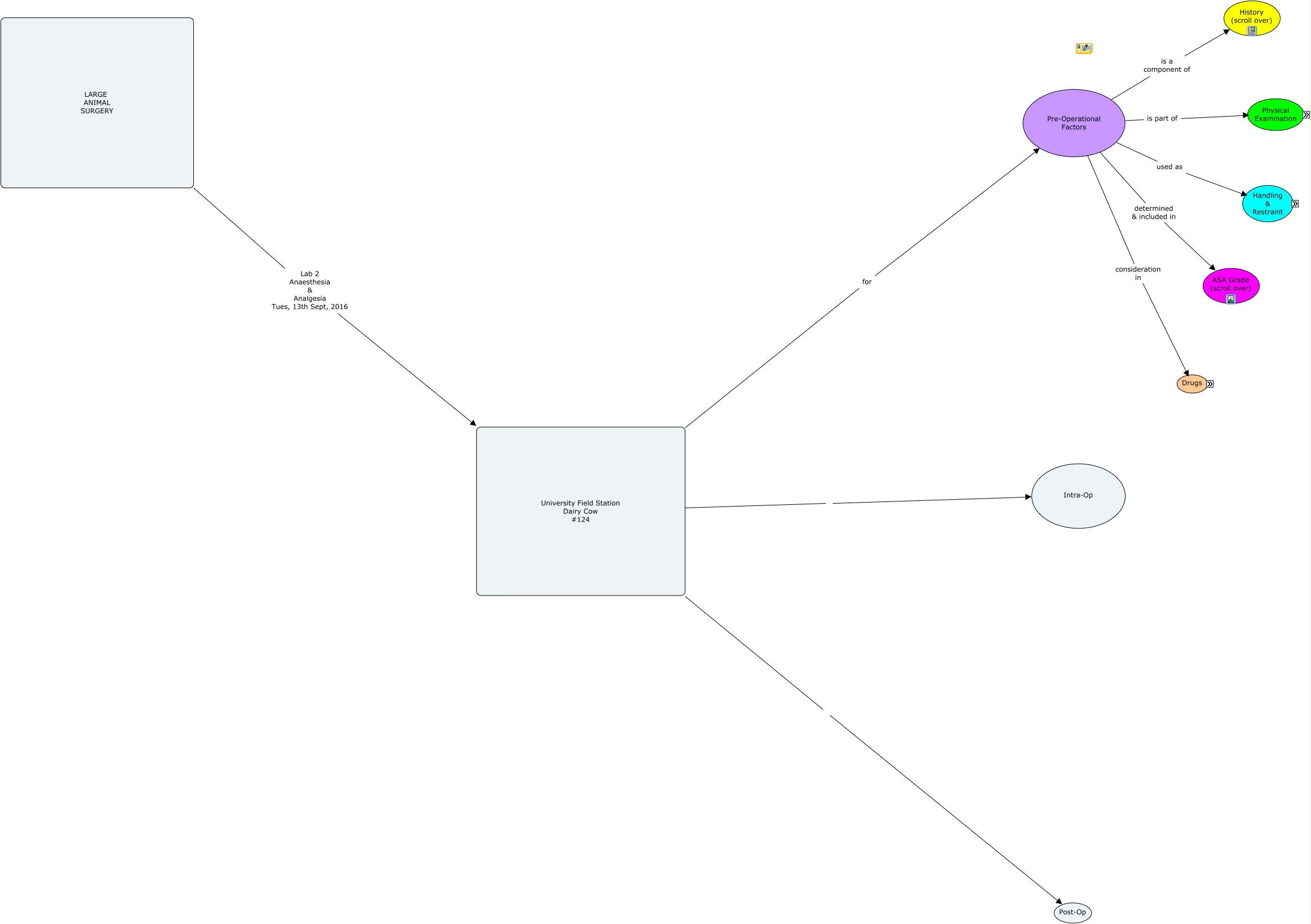 This Concept Map, created with IHMC CmapTools, has information related to: LAB 2 Anaesthesia & Analgesia, Equipment is Weight Tape, LARGE ANIMAL SURGERY Lab 2 Anaesthesia & Analgesia Tues, 13th Sept, 2016 University Field Station Dairy Cow #124, Pre-Operational Factors used as Handling & Restraint, Drugs of Properties & Considerations, University Field Station Dairy Cow #124 for Pre-Operational Factors, Properties & Considerations Lidocaine, Handling & Restraint used in Knot, Physical Examination (scroll over) Pulse Rate 48bpm, Physical Examination (scroll over) Weight 378Kg, Physical Examination (scroll over) Respiration Rate 34bpm, Handling & Restraint used in General Safety Considerations, Handling & Restraint used in Equipment, Equipment is Nose Pinch, Knot is a Halter (scroll over), Properties & Considerations Ketamine, Properties & Considerations Tolazoline, Drugs of Dosages & Calculations, Pre-Operational Factors determined & included in ASA Grade (scroll over), University Field Station Dairy Cow #124 Intra-Op, Equipment are Syringes
