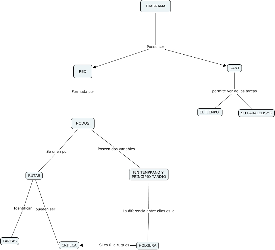 This Concept Map, created with IHMC CmapTools, has information related to: Ejercicio_1, NODOS Poseen dos variables FIN TEMPRANO Y PRINCIPIO TARDIO, DIAGRAMA Puede ser GANT, HOLGURA Si es 0 la ruta es CRITICA, NODOS Se unen por RUTAS, FIN TEMPRANO Y PRINCIPIO TARDIO La diferencia entre ellos es la HOLGURA, RUTAS pueden ser CRITICA, RED Formada por NODOS, DIAGRAMA Puede ser RED, GANT permite ver de las tareas EL TIEMPO, RUTAS Identifican TAREAS, GANT permite ver de las tareas SU PARALELISMO