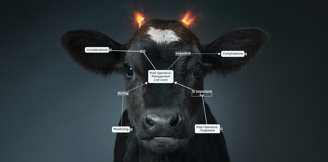 This Concept Map, created with IHMC CmapTools, has information related to: Post-Operative Management, Monitoring (roll over) Includes Observe the animals gait for signs of brain damage., Bacterial Infection Manifestation & Clinical Signs Include Frontal Sinusitis: anorexia, pyrexia, unilateral or bilateral nasal discharge, halitosis, neurological signs(if chronic), Monitoring (roll over) during Post-Operative Management (roll over), Monitoring (roll over) Includes Checking for signs of unnecessary pain (roll over), Monitoring (roll over) Includes Check TPR, dehydration status and mentality of the animal. (roll over), Post-Operation Treatment included Tetravet (roll over) An broad spectrum aerosol antibiotics spary containing, oxytetracycline and Gentian violet. It is used to topical treatment of woundsand cuts., Frontal Sinusitis: anorexia, pyrexia, unilateral or bilateral nasal discharge, halitosis, neurological signs(if chronic) Can be treated with more Administration of Penicillin-Streptomycin (roll over), Considerations Include Advise the farmer of what signs of infection to look for. (roll over), Monitoring (roll over) Includes Checking for signs of infection (roll over), Monitoring (roll over) Includes Check the wound for fly eggs & injection sites for hematomas, Fly Repellant (roll over) For prevention of Myiasis, Considerations for Post-Operative Management (roll over), Post-Operative Management (roll over) expected Complications, Mineral Oil and Forceps (roll over) For treatment of Myiasis, Complications Include Myiasis, Ivermectin 1% (roll over) For treatment of Myiasis, Bacterial Infection Can be prevented by Prophylactic treatment Dressing the surgical wound with an antibiotic spray daily, Complications Include Brain damage (roll over), Post-Operation Treatment included Nitrofurazone Ointment (roll Over) A water-soluble antibacterial ointment for the prevention or treatment of surface bacterial infections of wounds, burns, and cutaneous ulcers., Post-Operation Treatment is important for Post-Operative Management (roll over)