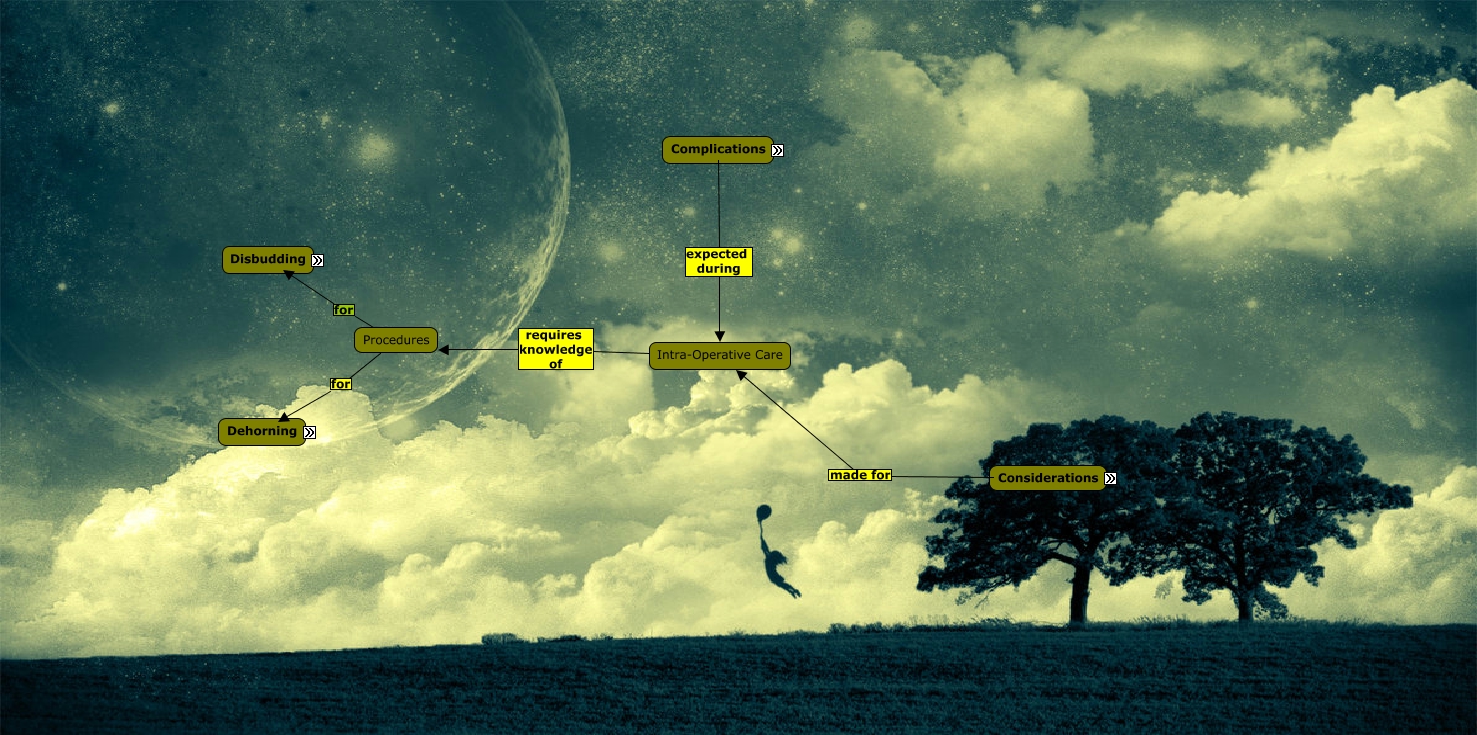 This Concept Map, created with IHMC CmapTools, has information related to: Intra-Operative Management, Procedures for Disbudding, Chemical This is caustic soda which destroys the horn bud cells. This is a non-specific caustic agent so if the product gets anywhere else it can cause significant irritation and tissue damage, including blindness. (roll over). by Disbudding, Failure to Induce Anesthesia can be solved by Giving another dose of Lidocaine (roll over) Be sure to stay withing the lethal dose range., Intra-Operative Care requires knowledge of Procedures, Procedures for Dehorning, Considerations also Sanitation Instruments and equipment were disinfected using diluted iodine solution to prevent spread of diseases., Disbudding by Tube/scoop Dehorner These will disbud cattle quickly and efficiently, but cause significantly more pain and distress than disbudding with a hot iron, so their use should be avoided. (roll over), Failure to Induce Anesthesia can be solved by Performing a Ring Block (roll over) This injection should block cutaneous branches of cervical nerves, Dehorning done by use of Barnes Dehorner (roll over) A Barnes dehorner is a hinged, closed set of sharp scoops which is placed over the horn against the base and surrounding skin. Opening the handles forces the cutting edges together, slicing through the skin and under the horn., Considerations made for Intra-Operative Care, Dehorning also by Keystone Dehorner (roll over) A keystone dehorner has two handles that move a blade downward against a plate or another blade, slicing through the base of the horn and surrounding skin., Complications can also be Non-Sugical This includes burns from hot iron & needle-sticks injury,, Considerations for Anesthesia (roll over) Lidocaine 2% Solution was used with 5ml (100mg) injected in to both sites for a total of 10ml (200mg) which is with the lethal dose of 57.5ml (1150mg), Considerations about Time Management (roll over) Anesthetic effect of Lidocaine can last 45-60 mins. This should be enough time to complete the procedure provided there are no complication., Complications such as Hemorrhage (roll over) If animal starts bleeding excessively, use a hemostat to clap/twist the vessel. Catherization with a hot iron can also stop bleeding., Dehorning done by use of Gigli wire (roll over) A long piece of wire is attached to two handles, then moved back and forth rapidly to saw through the horn base plus a ½-inch circle of skin., Complications such as Failure to Induce Anesthesia, Dehorning also by Callicrate Bander The use of castrating bands to remove horns is probably the least stressful and cost effective method available. Most horns come off slick, and stay that way., Hot Iron The aim when disbudding is to burn and destroy the horn-producing tissue around the horn bud. It is not essential to remove the horn bud itself as it will not grow if the horn-producing tissue around it is destroyed. (roll over) by Disbudding, Complications expected during Intra-Operative Care