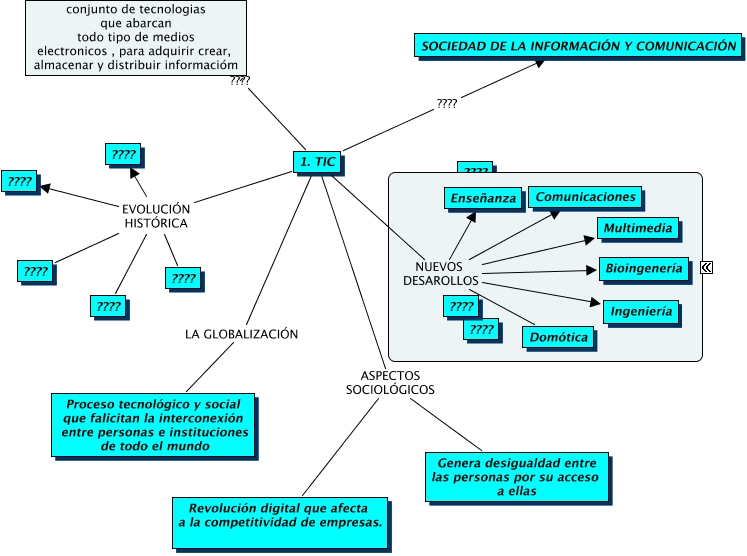 Este Cmap, tiene información relacionada con: cmap U1, 1. TIC ???? conjunto de tecnologias que abarcan todo tipo de medios electronicos , para adquirir crear, almacenar y distribuir informacióm, 1. TIC ASPECTOS SOCIOLÓGICOS Revolución digital que afecta a la competitividad de empresas., 1. TIC LA GLOBALIZACIÓN Proceso tecnológico y social que falicitan la interconexión entre personas e instituciones de todo el mundo, 1. TIC EVOLUCIÓN HISTÓRICA ????, 1. TIC ???? SOCIEDAD DE LA INFORMACIÓN Y COMUNICACIÓN, 1. TIC ASPECTOS SOCIOLÓGICOS Genera desigualdad entre las personas por su acceso a ellas, 1. TIC NUEVOS DESAROLLOS Enseñanza, 1. TIC NUEVOS DESAROLLOS Comunicaciones, 1. TIC EVOLUCIÓN HISTÓRICA ????, 1. TIC NUEVOS DESAROLLOS Domótica, 1. TIC EVOLUCIÓN HISTÓRICA ????, 1. TIC NUEVOS DESAROLLOS Ingeniería, 1. TIC NUEVOS DESAROLLOS Multimedia, 1. TIC EVOLUCIÓN HISTÓRICA ????, 1. TIC EVOLUCIÓN HISTÓRICA ????, 1. TIC NUEVOS DESAROLLOS Bioingenería