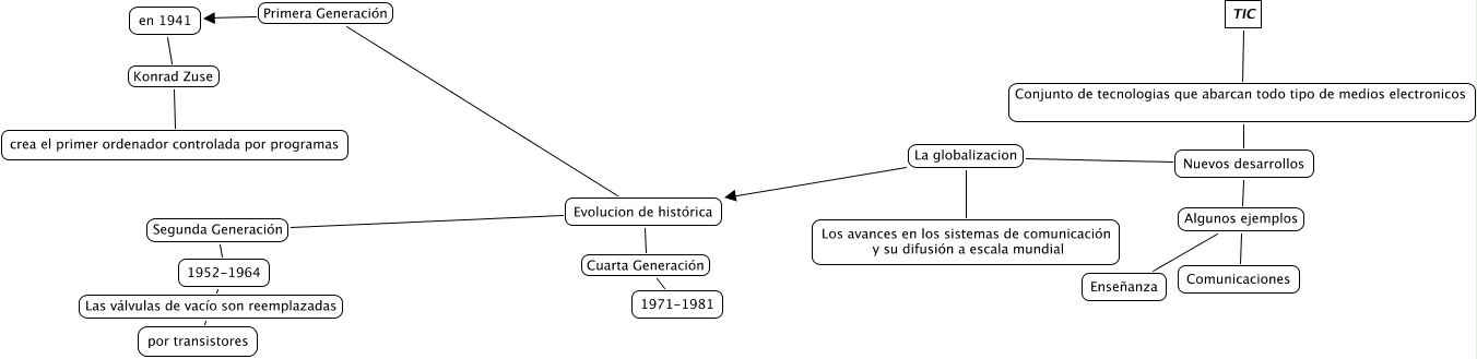Este Cmap, tiene información relacionada con: Sin Título 2, en 1941 Konrad Zuse crea el primer ordenador controlada por programas, Evolucion de histórica Segunda Generación 1952-1964, TIC Conjunto de tecnologias que abarcan todo tipo de medios electronicos Nuevos desarrollos, Nuevos desarrollos Algunos ejemplos Comunicaciones, Nuevos desarrollos Algunos ejemplos Enseñanza, Nuevos desarrollos La globalizacion Evolucion de histórica, Evolucion de histórica Cuarta Generación 1971-1981, Evolucion de histórica Primera Generación en 1941, 1952-1964 Las válvulas de vacío son reemplazadas por transistores, Nuevos desarrollos La globalizacion Los avances en los sistemas de comunicación y su difusión a escala mundial