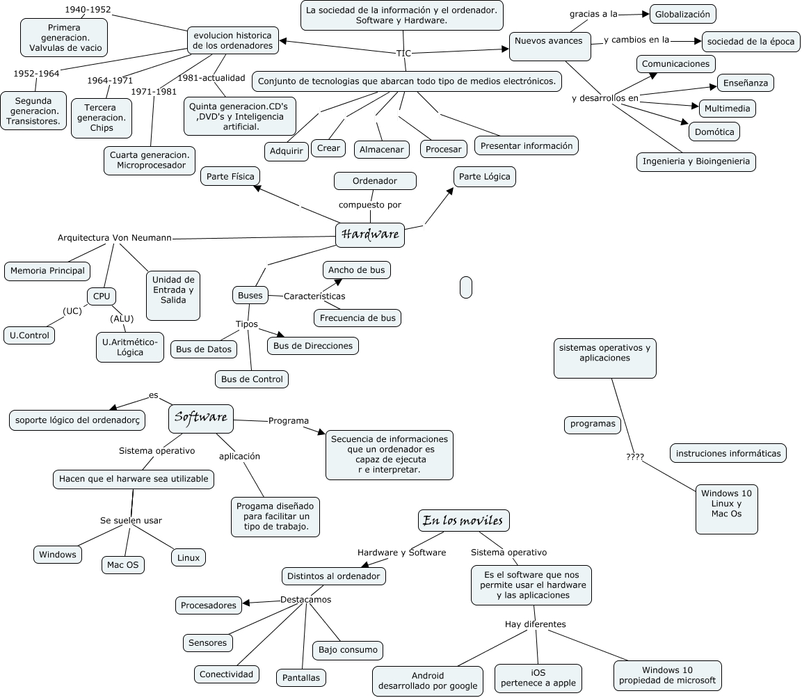 Este Cmap, tiene información relacionada con: trabajo, Conjunto de tecnologias que abarcan todo tipo de medios electrónicos. Presentar información, En los moviles Hardware y Software Distintos al ordenador, La sociedad de la información y el ordenador. Software y Hardware. TIC evolucion historica de los ordenadores, Buses Características Frecuencia de bus, Es el software que nos permite usar el hardware y las aplicaciones Hay diferentes Windows 10 propiedad de microsoft, Es el software que nos permite usar el hardware y las aplicaciones Hay diferentes Android desarrollado por google, Hacen que el harware sea utilizable Linux, Hardware Parte Lógica, Software es soporte lógico del ordenadorç, Distintos al ordenador Destacamos Pantallas, Ordenador compuesto por Hardware, Software Sistema operativo Hacen que el harware sea utilizable, Hardware Buses, Buses Tipos Bus de Datos, Nuevos avances gracias a la Globalización, Es el software que nos permite usar el hardware y las aplicaciones Hay diferentes iOS pertenece a apple, evolucion historica de los ordenadores 1981-actualidad Quinta generacion.CD's ,DVD's y Inteligencia artificial., evolucion historica de los ordenadores 1952-1964 Segunda generacion. Transistores., Distintos al ordenador Destacamos Conectividad, Conjunto de tecnologias que abarcan todo tipo de medios electrónicos. Almacenar