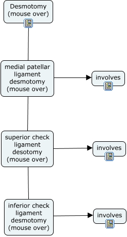 This Concept Map, created with IHMC CmapTools, has information related to: desmotomy, medial patellar ligament desmotomy (mouse over) ???? involves, superior check ligament desotomy (mouse over) ???? inferior check ligament desmotomy (mouse over), medial patellar ligament desmotomy (mouse over) ???? superior check ligament desotomy (mouse over), superior check ligament desotomy (mouse over) ???? involves, Desmotomy (mouse over) ???? medial patellar ligament desmotomy (mouse over), inferior check ligament desmotomy (mouse over) ???? involves