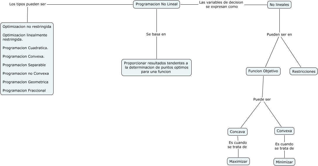 This Concept Map, created with IHMC CmapTools, has information related to: Programacion no Lineal, Funcion Objetivo Puede ser Concava, Funcion Objetivo Puede ser Convexa, Programacion No Lineal Se basa en Proporcionar resultados tendentes a la determinacion de puntos optimos para una funcion, No lineales Pueden ser en Restricciones, No lineales Pueden ser en Funcion Objetivo, Programacion No Lineal Los tipos pueden ser Optimizacion no restringida Optimizacion linealmente restringida. Programacion Cuadratica. Programacion Convexa. Programacion Separable Programacion no Convexa Programacion Geometrica Programacion Fraccional, Convexa Es cuando se trata de Minimizar, Programacion No Lineal Las variables de decision se expresan como No lineales, Concava Es cuando se trata de Maximizar
