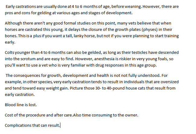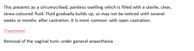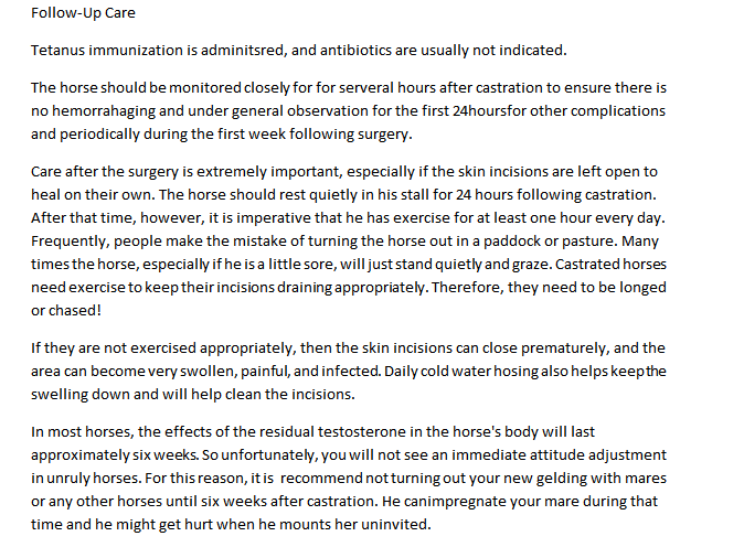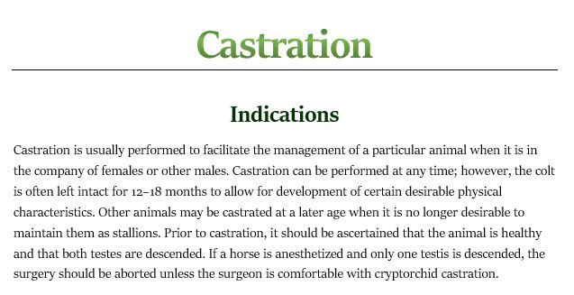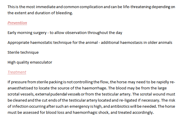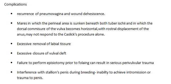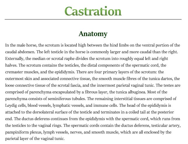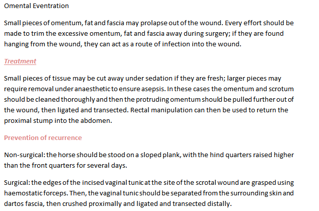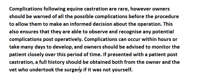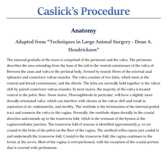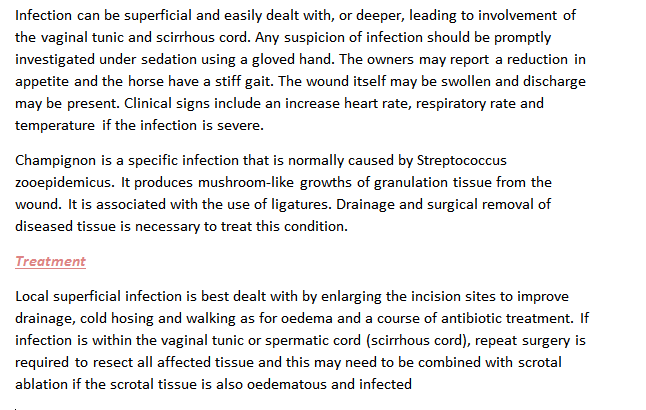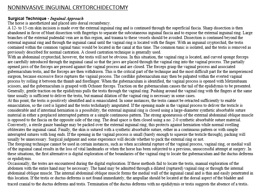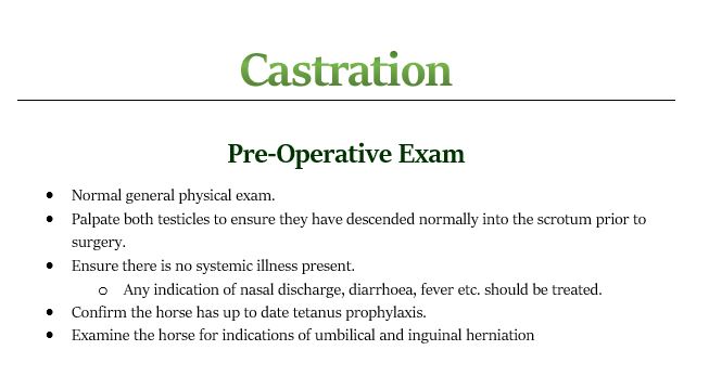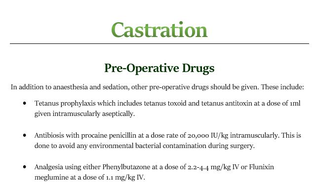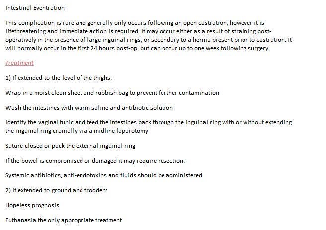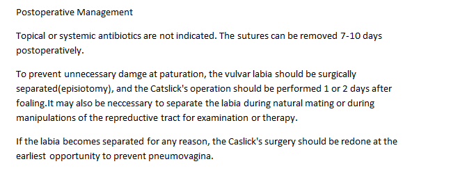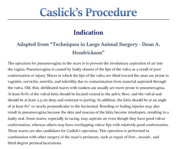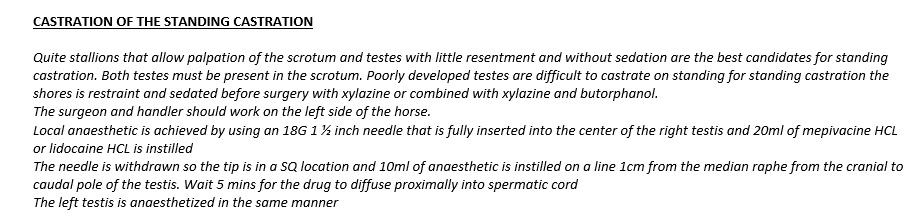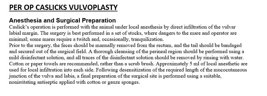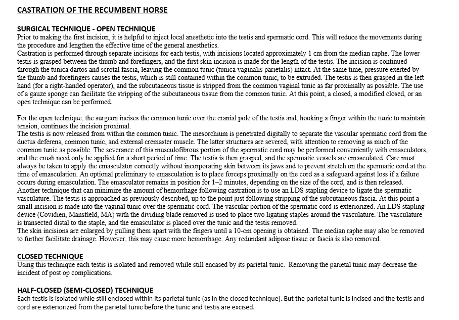 Advantages of castration.PNG Anatomy 1.jpg Anatomy 2.jpg Caslick's Procedure.cmap Caslick's Procedure Indication.JPG Caslick's Procedure Surgical Technique.pdf Caslick's Procedure Video.url Caslicks per op.PNG Castration.cmap Castration Anaesthesia.pdf Castration Anatomy.JPG Castration Complications.pdf Castration Indication.JPG castration recumbant horse.PNG closed tech 1.PNG closed tech 2.PNG closed tech 3.PNG closed tech 4.PNG Complications of caslick.PNG Disadvantages catslick.rtf Disadvantages of castration in horses.PNG Follow up care castration of horses.PNG Haemorrhage.PNG Hydrocoele.PNG Indications for Caslick.rtf Infection.PNG Intestinal Eventration.PNG noninvasive inguinal crypt.PNG noninvasive inguinal crypt procedure.PNG oedema.PNG Omental Eventration.PNG PO of Mares.PNG Pre-Op Drugs.JPG Pre-Op Exam.JPG Prognosis of Castration in horses.PNG Relevant Anatomy.JPG standing castration.PNG Treatment_penile_prolapse_in_horses_using_a_modifi.pdf Vulval Conformation.png