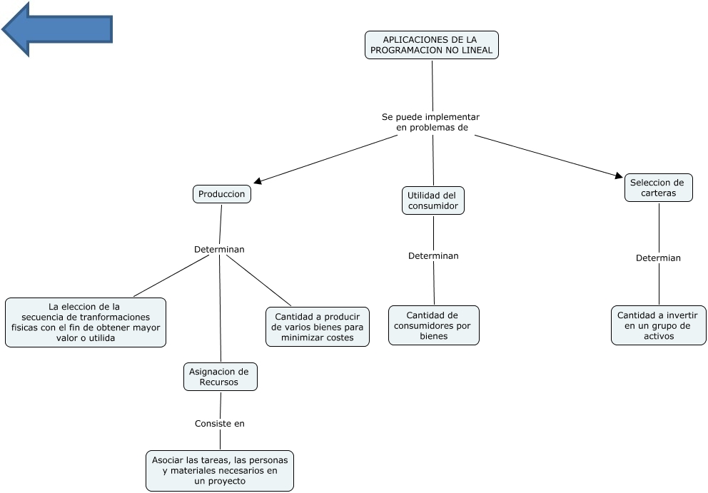 This Concept Map, created with IHMC CmapTools, has information related to: Aplicacion de la PNL, APLICACIONES DE LA PROGRAMACION NO LINEAL Se puede implementar en problemas de Produccion, Produccion Determinan Asignacion de Recursos, Asignacion de Recursos Consiste en Asociar las tareas, las personas y materiales necesarios en un proyecto, Produccion Determinan Cantidad a producir de varios bienes para minimizar costes, Utilidad del consumidor Determinan Cantidad de consumidores por bienes, Produccion Determinan La eleccion de la secuencia de tranformaciones fisicas con el fin de obtener mayor valor o utilida, APLICACIONES DE LA PROGRAMACION NO LINEAL Se puede implementar en problemas de Seleccion de carteras, Seleccion de carteras Determian Cantidad a invertir en un grupo de activos, APLICACIONES DE LA PROGRAMACION NO LINEAL Se puede implementar en problemas de Utilidad del consumidor