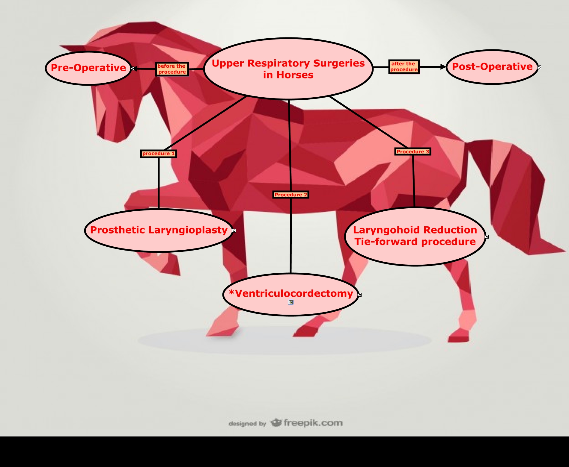 This Concept Map, created with IHMC CmapTools, has information related to: Upper Respiratory Surgeries in Horses, Surgical Procedure what may happen after *Post-Op Complications Wound infections Infection of the implants Surgical Failure, *Surgical Technique Alternatively.... *Laser Ventriculocordectomy, General Post Operative Considerations how to insecure the horse recovers as best as it could *Basic Physical Examination, Physical Restraint usually minimal restraint the use of staunchion tend to cause more risk to the clinian, General Post Operative Considerations how to insecure the horse recovers as best as it could *Intravenous Catheter Site, Pre-Operative involves Physical Restraint, *Heavy Sedaties for Standing or Recumbant horses the Alpha 2 agnoist *Detomidine (0.12ml/100kg) (0.02-0.04 mg/kg), Upper Respiratory Surgeries in Horses after the procedure Post-Operative, *Ketamine HCL used only after these other drugs *Detomidine (0.12ml/100kg) (0.02-0.04 mg/kg), General Post Operative Considerations how to insecure the horse recovers as best as it could *Incision, Ventriculodectomy Firstly, *Anaesthesia & Surgical Prep, Surgical Procedure what may happen after *Post op management NSAIDS Antibtioics Removal of staples at 14 days Feeding at a shoulder height to prevent lowering of the head and stretching of sutures Trotting exercises after 14 days, Ventriculodectomy The Procedure *Surgical Technique, *Heavy Sedaties for Standing or Recumbant horses the opioid *Butorphanol (0.2ml/100kg) or (0.01 mg/kg), *Dorsal displacement of the soft palate (DDSP) can be treated with a *Non surgical Treatment, Ventriculodectomy Lastly, *Post Op MAnagement, Pharmaceutical Use specifically Dosage, Physical Restraint usually minimal restraint *Lips twitch or chain, *Client Education must involve *Confinement, *Romifidine (0.9ml/ 100kg) (0.05-0.1mg/kg) should not be used when *Contraindicated