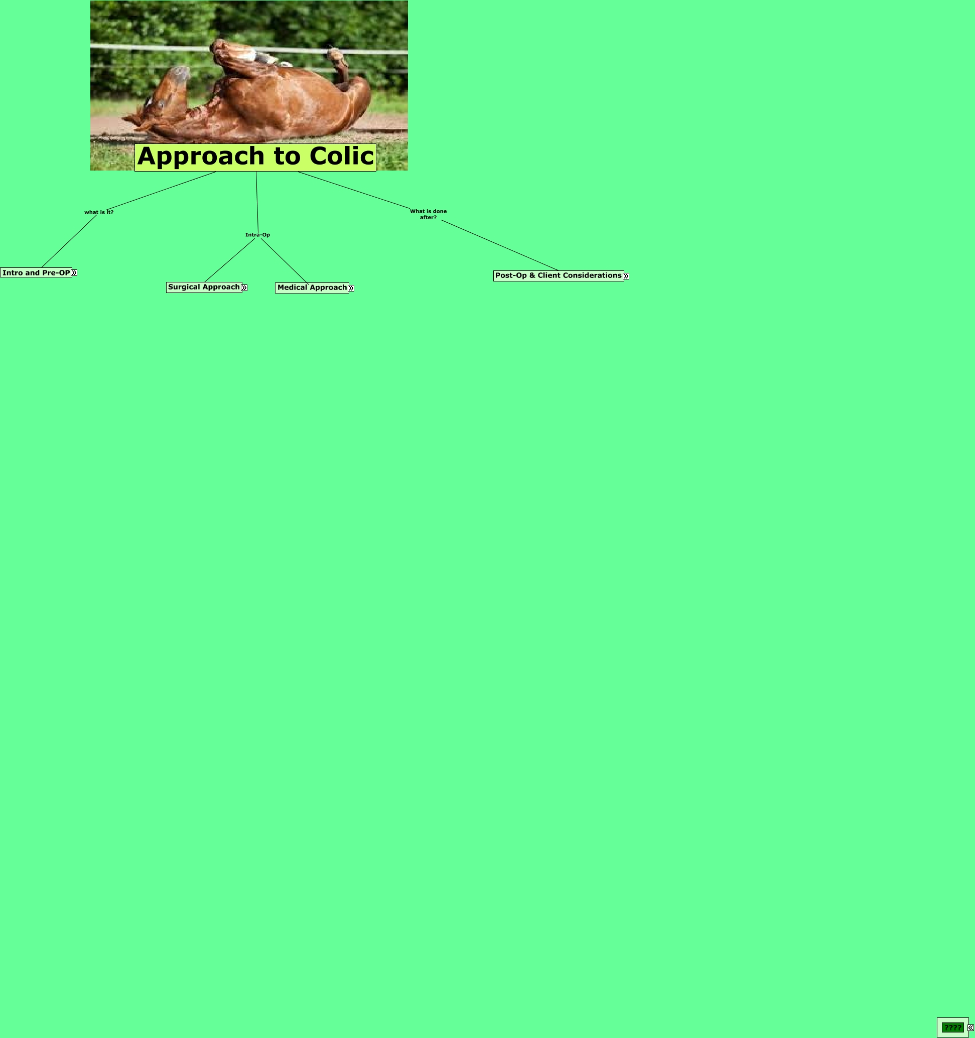 This Concept Map, created with IHMC CmapTools, has information related to: Appoarch to Colic in horses, *Classic Coliic Surgery Candidate Possible Surgical Colic Diseases *Colon Torsion, *Xylazine 10% (0.5 mL/100 lbs) not really used much in colic cases *Contraindicated, Medical/ non surgical approach some cases Intestinal Lubricants and Laxatives, Intestinal Lubricants and Laxatives most commonly Mineral Oil, Enteric Bacteria Endotoxin Tx early effects Prostaglandins, Medical/ non surgical approach cover all bases Deworming, Approach to Colic Intra-Op Medical/ non surgical approach, Colic what signs are seen *Clinical Signs: - Looking at flanks – Pawing – Grinding teeth – Muscle tremors – Sweating – Frequent posturing to urinate – Leaning or lying down – Rolling – Resting in un-natural positions - Violent rolling, kicking at belly, crashing to ground - Total disregard for self and others – Self trauma - Generalised sweating - Distension of abdomen, *Classic Coliic Surgery Candidate Surgical Status, Colic how would you diagnois it? *Diagnosis: It is based on history and clinical signs Degree of pain The heart rate and physical behavior Asculation of the abdomen Rectal Examinations Nasogastric intubation Abdominocentsis, *Ketamine HCL used only after these other drugs *Romifidine (0.9ml/ 100kg) (0.05-0.1mg/kg), Approach to Colic Intra-Op Surgical Approach, Colic what drugs are used in colic cases *Analgesia – Flunixin – Ketoprofen – Buscopan (dipyrone/ Hyoscine) – Phenylbutazone Sedation – Xylazine - detomidine - Romifidine, Pain Relief for sedation Xylazine, Intestinal Lubricants and Laxatives stronger Dioctyl sodium sulfosuccinate, Approach to Colic What is done after? Post-Op & Client Considerations, *Heavy Sedations for Standing or Recumbant horses disassociative analgesic *Ketamine HCL, Medical/ non surgical approach prevent dehydration Fluid Therapy, *Analgesia – Flunixin – Ketoprofen – Buscopan (dipyrone/ Hyoscine) – Phenylbutazone Sedation – Xylazine - detomidine - Romifidine the drugs used for pain and Sedation Sedatives, Complications side effects of medical Tx Diarrhea