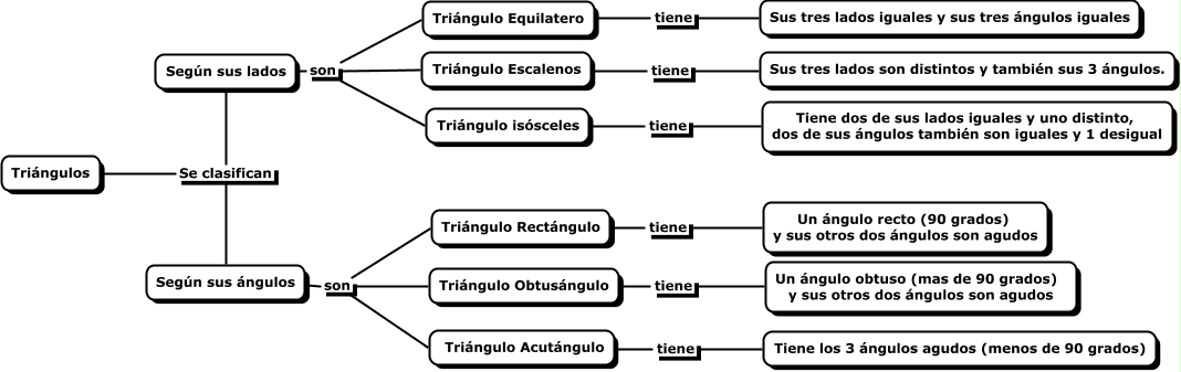 Este Cmap, tiene información relacionada con: Triangulos, Según sus lados son Triángulo isósceles, Triángulo isósceles tiene Tiene dos de sus lados iguales y uno distinto, dos de sus ángulos también son iguales y 1 desigual, Según sus lados son Triángulo Equilatero, Triángulo Rectángulo tiene Un ángulo recto (90 grados) y sus otros dos ángulos son agudos, Según sus ángulos son Triángulo Obtusángulo, Triángulo Obtusángulo tiene Un ángulo obtuso (mas de 90 grados) y sus otros dos ángulos son agudos, Triángulo Escalenos tiene Sus tres lados son distintos y también sus 3 ángulos., Triángulo Equilatero tiene Sus tres lados iguales y sus tres ángulos iguales, Triángulos Se clasifican Según sus lados, Triángulo Acutángulo tiene Tiene los 3 ángulos agudos (menos de 90 grados), Según sus lados son Triángulo Escalenos, Según sus ángulos son Triángulo Acutángulo, Según sus ángulos son Triángulo Rectángulo, Triángulos Se clasifican Según sus ángulos