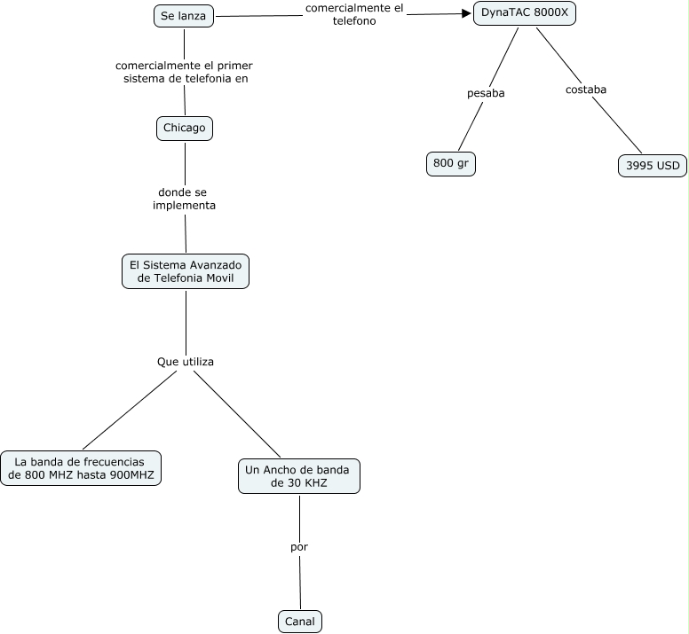 This Concept Map, created with IHMC CmapTools, has information related to: 1983, DynaTAC 8000X costaba 3995 USD, Chicago donde se implementa El Sistema Avanzado de Telefonia Movil, DynaTAC 8000X pesaba 800 gr, Un Ancho de banda de 30 KHZ por Canal, Se lanza comercialmente el telefono DynaTAC 8000X, Se lanza comercialmente el primer sistema de telefonia en Chicago, El Sistema Avanzado de Telefonia Movil Que utiliza Un Ancho de banda de 30 KHZ, El Sistema Avanzado de Telefonia Movil Que utiliza La banda de frecuencias de 800 MHZ hasta 900MHZ