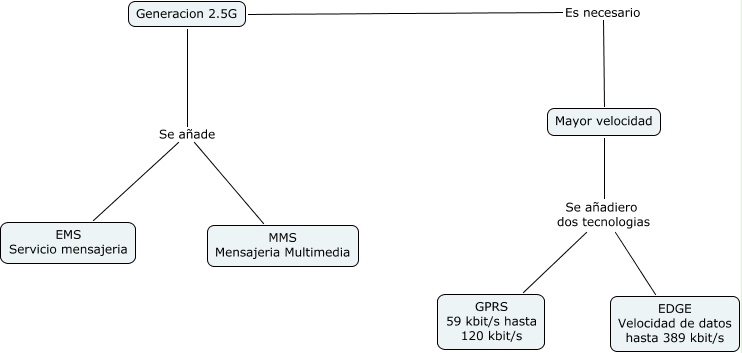 This Concept Map, created with IHMC CmapTools, has information related to: 2.5G, Generacion 2.5G Se añade EMS Servicio mensajeria, Generacion 2.5G Es necesario Mayor velocidad, Mayor velocidad Se añadiero dos tecnologias GPRS 59 kbit/s hasta 120 kbit/s, Mayor velocidad Se añadiero dos tecnologias EDGE Velocidad de datos hasta 389 kbit/s, Generacion 2.5G Se añade MMS Mensajeria Multimedia