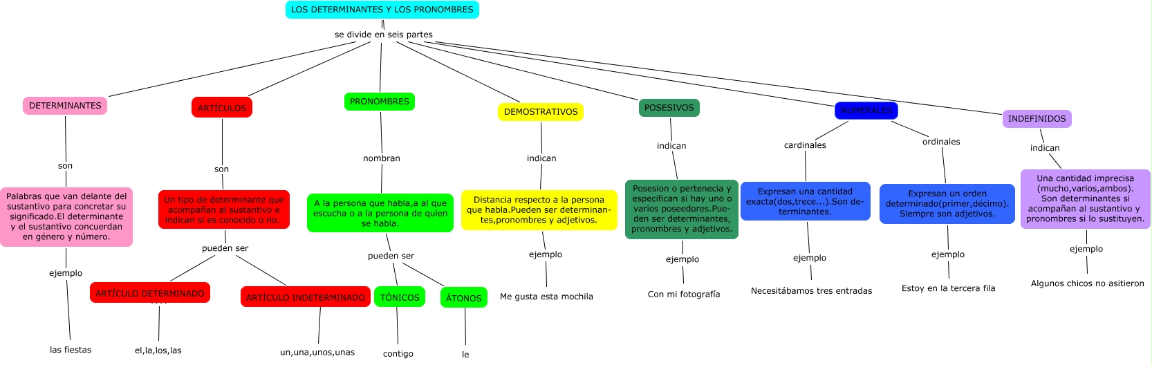Este Cmap, tiene información relacionada con: Los determinantes y Los Pronombres(Joshua y VictoriaÇ, NUMERALES ordinales Expresan un orden determinado(primer,décimo). Siempre son adjetivos., DETERMINANTES se divide en seis partes LOS DETERMINANTES Y LOS PRONOMBRES, DETERMINANTES se divide en seis partes POSESIVOS, Un tipo de determinante que acompañan al sustantivo e indican si es conocido o no. pueden ser ARTÍCULO INDETERMINADO, DETERMINANTES son Palabras que van delante del sustantivo para concretar su significado.El determinante y el sustantivo concuerdan en género y número., Expresan una cantidad exacta(dos,trece...).Son de- terminantes. ejemplo Necesitábamos tres entradas, ARTÍCULO DETERMINADO ???? el,la,los,las, DETERMINANTES se divide en seis partes DEMOSTRATIVOS, Palabras que van delante del sustantivo para concretar su significado.El determinante y el sustantivo concuerdan en género y número. ejemplo las fiestas, ARTÍCULO INDETERMINADO ???? un,una,unos,unas, INDEFINIDOS indican Una cantidad imprecisa (mucho,varios,ambos). Son determinantes si acompañan al sustantivo y pronombres si lo sustituyen., Expresan un orden determinado(primer,décimo). Siempre son adjetivos. ejemplo Estoy en la tercera fila, ÁTONOS ???? le, POSESIVOS indican Posesion o pertenecia y especifican si hay uno o varios poseedores.Pue- den ser determinantes, pronombres y adjetivos., ARTÍCULOS son Un tipo de determinante que acompañan al sustantivo e indican si es conocido o no., Una cantidad imprecisa (mucho,varios,ambos). Son determinantes si acompañan al sustantivo y pronombres si lo sustituyen. ejemplo Algunos chicos no asitieron, A la persona que habla,a al que escucha o a la persona de quien se habla. pueden ser ÁTONOS, DEMOSTRATIVOS indican Distancia respecto a la persona que habla.Pueden ser determinan- tes,pronombres y adjetivos., DETERMINANTES se divide en seis partes INDEFINIDOS, DETERMINANTES se divide en seis partes ARTÍCULOS