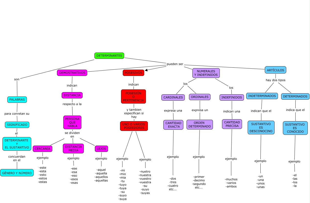 Este Cmap, tiene información relacionada con: LOS DETERMINANTES-María, Libana y Germán, NUMERALES Y INDEFINIDOS los ORDINALES, CARDINALES expresa una CANTIDAD EXACTA, INDEFINIDOS indican una CANTIDAD PRECISA, NUMERALES Y INDEFINIDOS los INDEFINIDOS, DETERMINANTES pueden ser ARTÍCULOS, PERSONA QUE HABLA se dividen en LEJOS, LEJOS ejemplo -aquel -aquella -aquellos -aquellas, SIGNIFICADO el DETERMINANTE Y EL SUSTANTIVO, PERSONA QUE HABLA se dividen en CERCANIA, DETERMINANTES pueden ser DEMOSTRATIVOS, CANTIDAD EXACTA ejemplo -dos -tres -cuatro etc..., UNO O VARIOS POSEEDORES ejemplo -mi -mio -mia -tu -tuyo -tuya -su -suyo -suya, DETERMINANTES pueden ser POSESIVOS, DETERMINANTE Y EL SUSTANTIVO concuerdan en el GÉNERO Y NÚMERO, CANTIDAD PRECISA ejemplo -muchos -varios -ambos, DISTANCIA respecto a la PERSONA QUE HABLA, DISTANCIA MEDIA ejemplo -ese -esa -eso -esos -esas, SUSTANTIVO ES CONOCIDO ejemplo -el -las -los -la, POSESIÓN O PERTENENCIA y tambien especifican si hay UNO O VARIOS POSEEDORES, PALABRAS para conretan su SIGNIFICADO