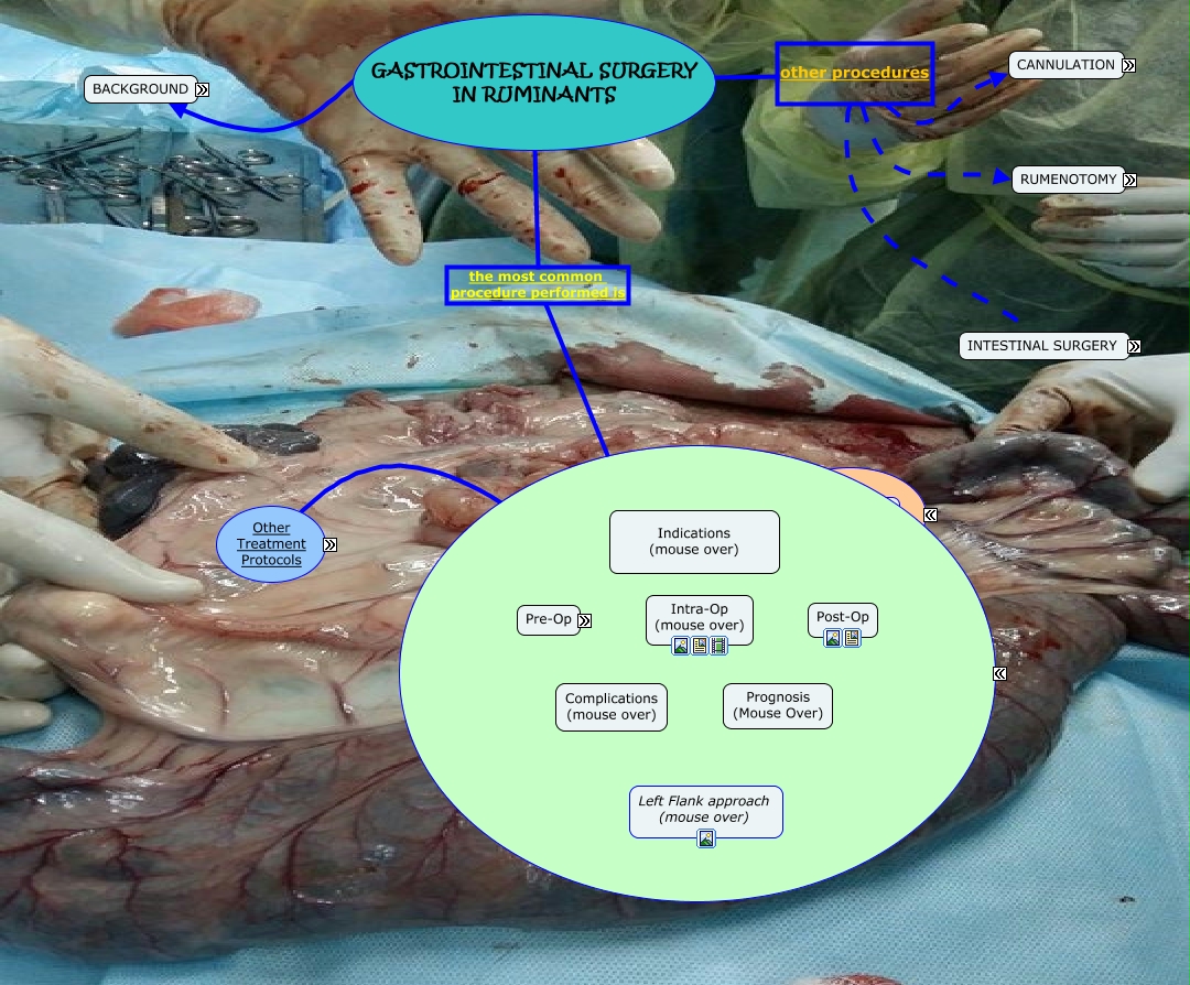 This Concept Map, created with IHMC CmapTools, has information related to: Ruminant Digestive Tract Surgery, GASTROINTESTINAL SURGERY IN RUMINANTS other procedures RUMENOTOMY, Surgical vs Non-Surgical, GASTROINTESTINAL SURGERY IN RUMINANTS ???? BACKGROUND, GASTROINTESTINAL SURGERY IN RUMINANTS the most common procedure performed is LAPAROTOMY, LAPAROTOMY ???? ALTERNATIVE, LAPAROTOMY ???? Other Treatment Protocols, GASTROINTESTINAL SURGERY IN RUMINANTS other procedures INTESTINAL SURGERY, GASTROINTESTINAL SURGERY IN RUMINANTS other procedures CANNULATION