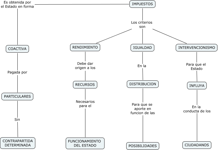 This Concept Map, created with IHMC CmapTools, has information related to: IMPUESTOS, COACTIVA Pagada por PARTICULARES, RECURSOS Necesarios para el FUNCIONAMIENTO DEL ESTADO, IMPUESTOS Los criterios son RENDIMIENTO, RENDIMIENTO Debe dar origen a los RECURSOS, INFLUYA En la conducta de los CIUDADANOS, IMPUESTOS Los criterios son INTERVENCIONISMO, IGUALDAD En la DISTRIBUCION, IMPUESTOS Es obtenida por el Estado en forma COACTIVA, PARTICULARES Sin CONTRAPARTIDA DETERMINADA, DISTRIBUCION Para que se aporte en funcion de las POSIBILIDADES, IMPUESTOS Los criterios son IGUALDAD, INTERVENCIONISMO Para que el Estado INFLUYA