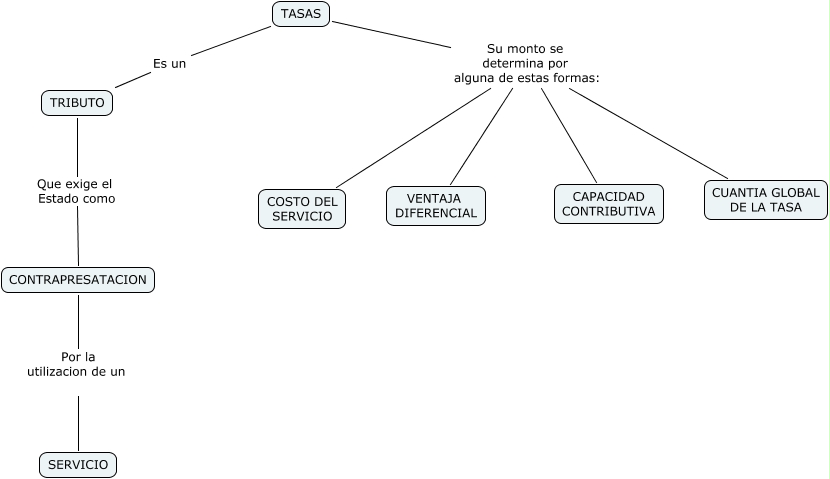 This Concept Map, created with IHMC CmapTools, has information related to: TASAS, TRIBUTO Que exige el Estado como CONTRAPRESATACION, TASAS Su monto se determina por alguna de estas formas: CAPACIDAD CONTRIBUTIVA, TASAS Es un TRIBUTO, TASAS Su monto se determina por alguna de estas formas: CUANTIA GLOBAL DE LA TASA, TASAS Su monto se determina por alguna de estas formas: VENTAJA DIFERENCIAL, TASAS Su monto se determina por alguna de estas formas: COSTO DEL SERVICIO, CONTRAPRESATACION Por la utilizacion de un SERVICIO
