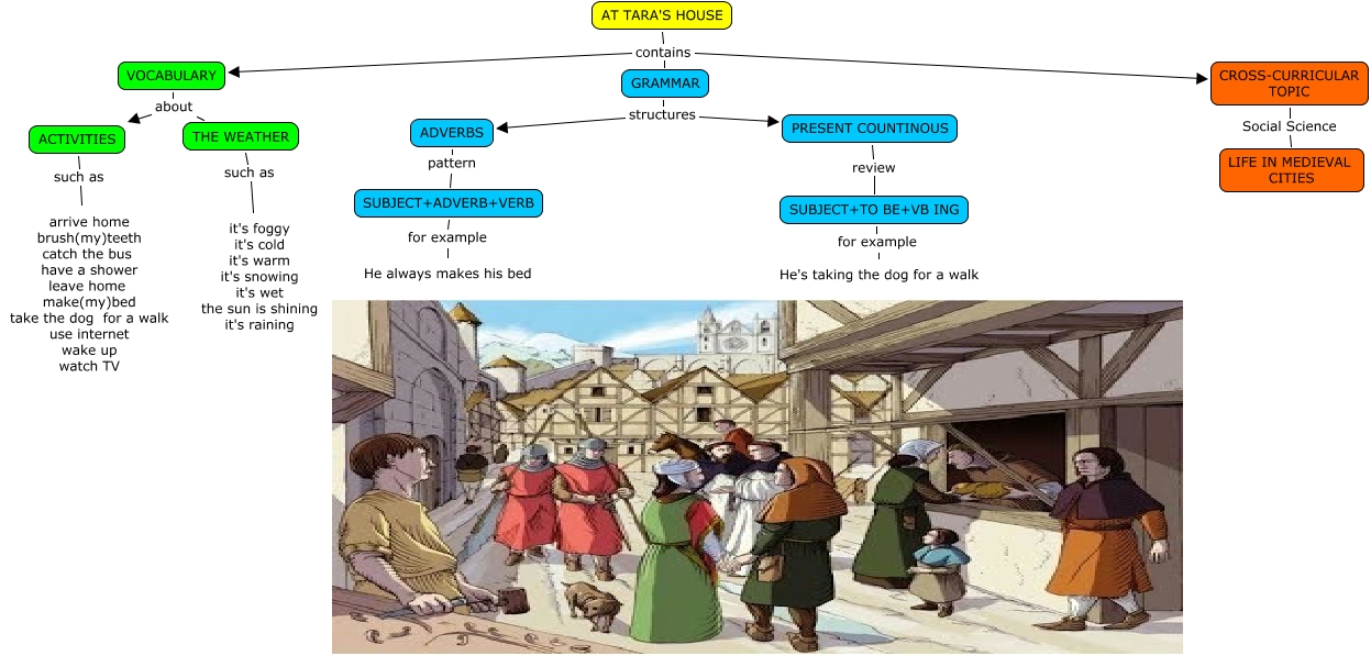 Este Cmap, tiene información relacionada con: AT TARA'S HOUSE_CARMEN, CROSS-CURRICULAR TOPIC Social Science LIFE IN MEDIEVAL CITIES, AT TARA'S HOUSE contains CROSS-CURRICULAR TOPIC, PRESENT COUNTINOUS review SUBJECT+TO BE+VB ING, GRAMMAR structures ADVERBS, ACTIVITIES such as arrive home brush(my)teeth catch the bus have a shower leave home make(my)bed take the dog for a walk use internet wake up watch TV, ADVERBS pattern SUBJECT+ADVERB+VERB, GRAMMAR structures PRESENT COUNTINOUS, SUBJECT+TO BE+VB ING for example He's taking the dog for a walk, THE WEATHER such as it's foggy it's cold it's warm it's snowing it's wet the sun is shining it's raining, VOCABULARY about THE WEATHER, SUBJECT+ADVERB+VERB for example He always makes his bed, AT TARA'S HOUSE contains GRAMMAR, VOCABULARY about ACTIVITIES, AT TARA'S HOUSE contains VOCABULARY