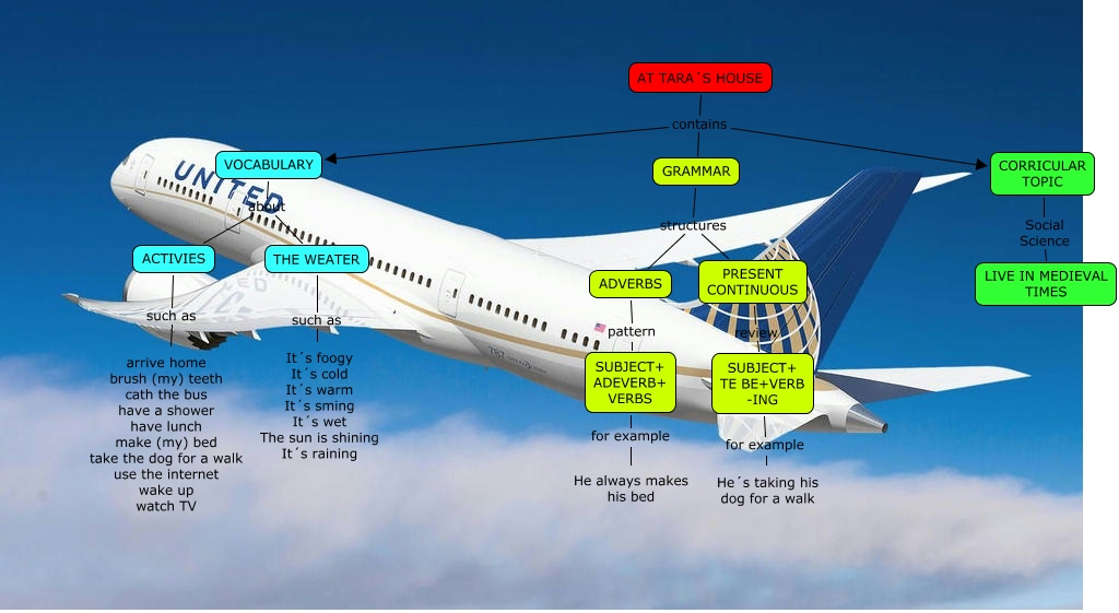 Este Cmap, tiene información relacionada con: AT TARA´S HOUSE GABRIEL, SUBJECT+ TE BE+VERB -ING for example He´s taking his dog for a walk, AT TARA´S HOUSE contains CORRICULAR TOPIC, GRAMMAR structures PRESENT CONTINUOUS, CORRICULAR TOPIC Social Science LIVE IN MEDIEVAL TIMES, VOCABULARY about ACTIVIES, ACTIVIES such as arrive home brush (my) teeth cath the bus have a shower have lunch make (my) bed take the dog for a walk use the internet wake up watch TV, GRAMMAR structures ADVERBS, PRESENT CONTINUOUS review SUBJECT+ TE BE+VERB -ING, ADVERBS pattern SUBJECT+ ADEVERB+ VERBS, THE WEATER such as It´s foogy It´s cold It´s warm It´s sming It´s wet The sun is shining It´s raining, AT TARA´S HOUSE contains GRAMMAR, AT TARA´S HOUSE contains VOCABULARY, SUBJECT+ ADEVERB+ VERBS for example He always makes his bed, VOCABULARY about THE WEATER