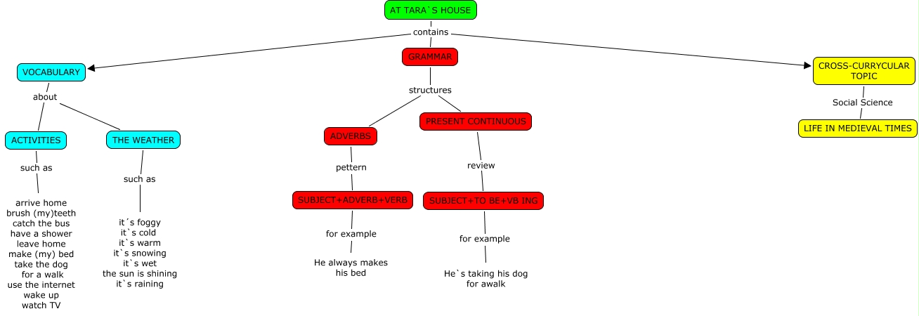 Este Cmap, tiene información relacionada con: AT TARA,, AT TARA`S HOUSE contains GRAMMAR, ACTIVITIES such as arrive home brush (my)teeth catch the bus have a shower leave home make (my) bed take the dog for a walk use the internet wake up watch TV, GRAMMAR structures PRESENT CONTINUOUS, VOCABULARY about THE WEATHER, AT TARA`S HOUSE contains VOCABULARY, PRESENT CONTINUOUS review SUBJECT+TO BE+VB ING, GRAMMAR structures ADVERBS, VOCABULARY about ACTIVITIES, SUBJECT+ADVERB+VERB for example He always makes his bed, AT TARA`S HOUSE contains CROSS-CURRYCULAR TOPIC, SUBJECT+TO BE+VB ING for example He`s taking his dog for awalk, ADVERBS pettern SUBJECT+ADVERB+VERB, CROSS-CURRYCULAR TOPIC Social Science LIFE IN MEDIEVAL TIMES, THE WEATHER such as it´s foggy it`s cold it`s warm it`s snowing it`s wet the sun is shining it`s raining