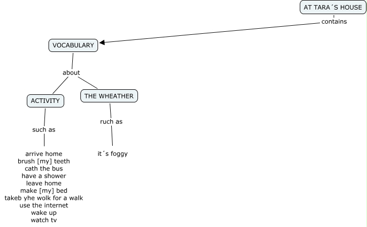 Este Cmap, tiene información relacionada con: AT TARA´S HOUSE_Marcos, VOCABULARY about THE WHEATHER, AT TARA´S HOUSE contains VOCABULARY, THE WHEATHER ruch as it´s foggy, VOCABULARY about ACTIVITY, ACTIVITY such as arrive home brush [my] teeth cath the bus have a shower leave home make [my] bed takeb yhe wolk for a walk use the internet wake up watch tv