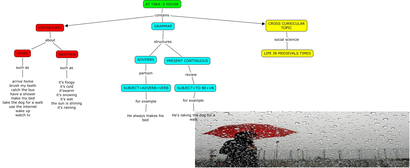 Este Cmap, tiene información relacionada con: AT TARA`'S HOUSE-ALEX, AT TARA´S HOUSE contains GRAMMAR, WEATHER such as it's foogy it's cold it'swarm it's snowing it's wet the sun is shining it's raining, GRAMMAR structures ADVERBS, VOCABULARY about VERBS, CROSS CURRICULAR TOPIC social sciencie LIFE IN MEDIEVALS TIMES, AT TARA´S HOUSE contains CROSS CURRICULAR TOPIC, GRAMMAR structures PRESENT CONTINUOUS, PRESENT CONTINUOUS review SUBJECT+TO BE+VB, ADVERBS partoon SUBJECT+ADVERB+VERB, VERBS such as arrive home brush my teeth catch the bus have a shower make my bed take the dog for a walk use the internet wake up watch tv, VOCABULARY about WEATHER, SUBJECT+TO BE+VB for example He's taking the dog for a walk, SUBJECT+ADVERB+VERB for example He always makes his bed, AT TARA´S HOUSE contains VOCABULARY
