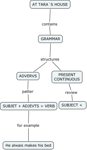 Este Cmap, tiene información relacionada con: AT TARA´S HOUSE Lucas, SUBJET + ADJEVTS + VERB for example He alwais makes his bed, AT TARA´S HOUSE contains GRAMMAR, GRAMMAR structures ADVERVS, GRAMMAR structures PRESENT CONTINUOUS, ADVERVS patter SUBJET + ADJEVTS + VERB, PRESENT CONTINUOUS review SUBJECT +