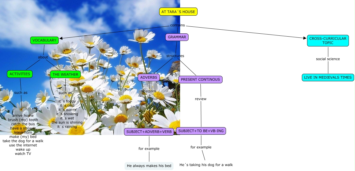Este Cmap, tiene información relacionada con: JAIME Y YAGO-AT TARA´S HOUSE, SUBJECT+TO BE+VB-ING for example He´s taking his dog for a walk, ACTIVITIES such as arrive home brush (my) teeth catch the bus have a shower leave hom make (my) bed take the dog for a walk use the internet wake up watch TV, PRESENT CONTINOUS structures ADVERBS, VOCABULARY about ACTIVITIES, AT TARA´S HOUSE contains CROSS-CURRICULAR TOPIC, ADVERBS pattern SUBJECT+ADVERB+VERB, AT TARA´S HOUSE contains VOCABULARY, VOCABULARY about THE WEATHER, GRAMMAR structures ADVERBS, CROSS-CURRICULAR TOPIC social science LIVE IN MEDIEVALS TIMES, THE WEATHER such as it´s foggy it´s cold it´s warm it´s snowing it´s wet the sun is shining it´s raining, AT TARA´S HOUSE contains GRAMMAR, SUBJECT+ADVERB+VERB for example He always makes his bed, PRESENT CONTINOUS review SUBJECT+TO BE+VB-ING
