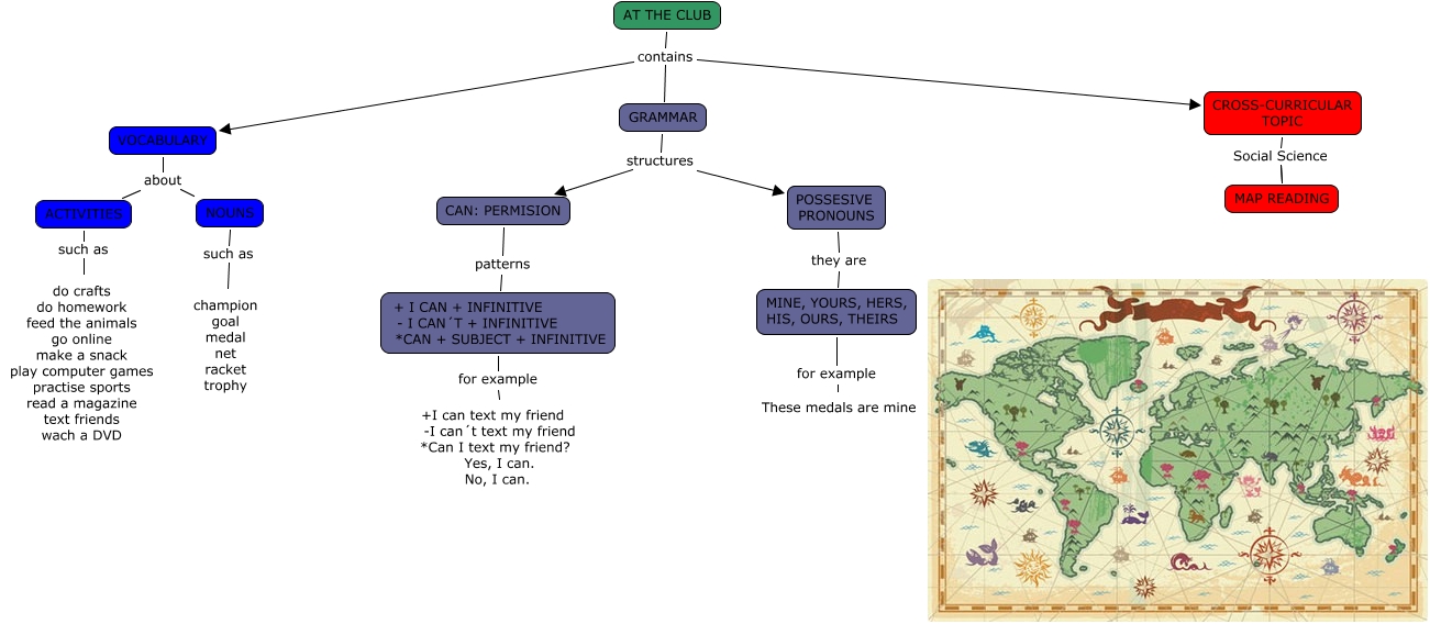 Este Cmap, tiene información relacionada con: AT THE CLUB-Carlos, ACTIVITIES such as do crafts do homework feed the animals go online make a snack play computer games practise sports read a magazine text friends wach a DVD, CAN: PERMISION patterns + I CAN + INFINITIVE - I CAN´T + INFINITIVE *CAN + SUBJECT + INFINITIVE, GRAMMAR structures CAN: PERMISION, NOUNS such as champion goal medal net racket trophy, AT THE CLUB contains VOCABULARY, VOCABULARY about NOUNS, VOCABULARY about ACTIVITIES, CROSS-CURRICULAR TOPIC Social Science MAP READING, AT THE CLUB contains GRAMMAR, AT THE CLUB contains CROSS-CURRICULAR TOPIC, POSSESIVE PRONOUNS they are MINE, YOURS, HERS, HIS, OURS, THEIRS, + I CAN + INFINITIVE - I CAN´T + INFINITIVE *CAN + SUBJECT + INFINITIVE for example +I can text my friend -I can´t text my friend *Can I text my friend? Yes, I can. No, I can., MINE, YOURS, HERS, HIS, OURS, THEIRS for example These medals are mine, GRAMMAR structures POSSESIVE PRONOUNS