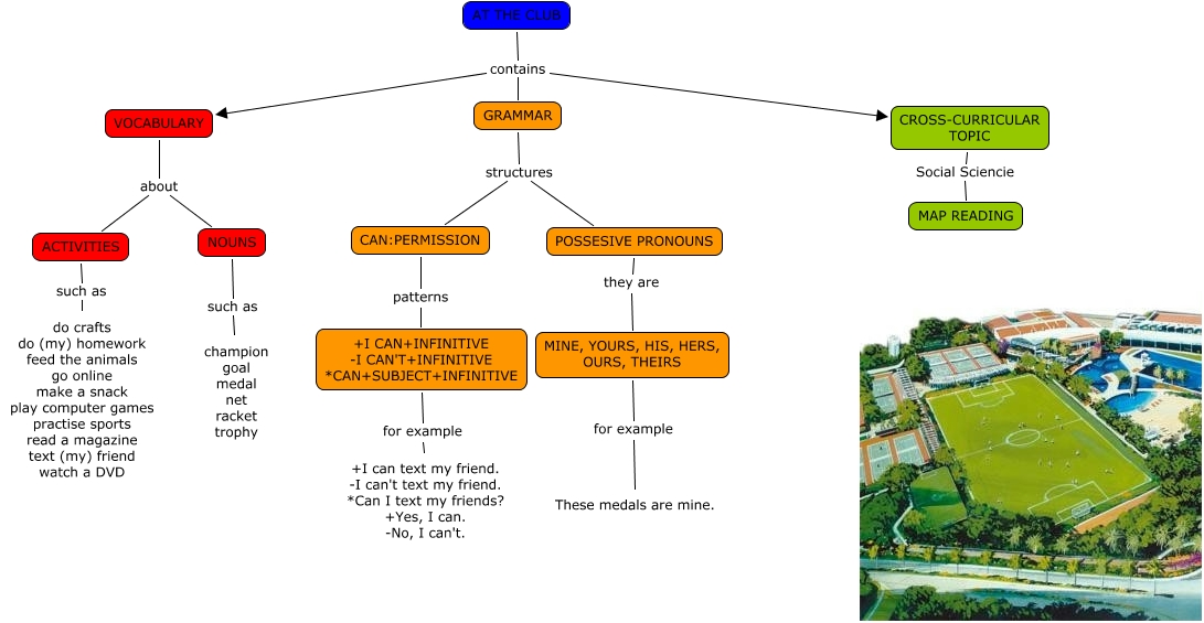 Este Cmap, tiene información relacionada con: AT THE CLUB-Germán, ACTIVITIES such as do crafts do (my) homework feed the animals go online make a snack play computer games practise sports read a magazine text (my) friend watch a DVD, AT THE CLUB contains GRAMMAR, VOCABULARY about ACTIVITIES, NOUNS such as champion goal medal net racket trophy, CROSS-CURRICULAR TOPIC Social Sciencie MAP READING, AT THE CLUB contains VOCABULARY, CAN:PERMISSION patterns +I CAN+INFINITIVE -I CAN'T+INFINITIVE *CAN+SUBJECT+INFINITIVE, GRAMMAR structures POSSESIVE PRONOUNS, VOCABULARY about NOUNS, AT THE CLUB contains CROSS-CURRICULAR TOPIC, +I CAN+INFINITIVE -I CAN'T+INFINITIVE *CAN+SUBJECT+INFINITIVE for example +I can text my friend. -I can't text my friend. *Can I text my friends? +Yes, I can. -No, I can't., GRAMMAR structures CAN:PERMISSION, MINE, YOURS, HIS, HERS, OURS, THEIRS for example These medals are mine., POSSESIVE PRONOUNS they are MINE, YOURS, HIS, HERS, OURS, THEIRS