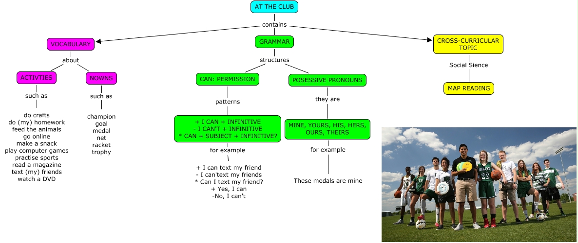 Este Cmap, tiene información relacionada con: AT THE CLUB -(María), GRAMMAR structures CAN: PERMISSION, GRAMMAR structures POSESSIVE PRONOUNS, CROSS-CURRICULAR TOPIC Social Sience MAP READING, NOWNS such as champion goal medal net racket trophy, MINE, YOURS, HIS, HERS, OURS, THEIRS for example These medals are mine, ACTIVTIES such as do crafts do (my) homework feed the animals go online make a snack play computer games practise sports read a magazine text (my) friends watch a DVD, VOCABULARY about ACTIVTIES, AT THE CLUB contains GRAMMAR, CAN: PERMISSION patterns + I CAN + INFINITIVE - I CAN'T + INFINITIVE * CAN + SUBJECT + INFINITIVE?, VOCABULARY about NOWNS, POSESSIVE PRONOUNS they are MINE, YOURS, HIS, HERS, OURS, THEIRS, AT THE CLUB contains CROSS-CURRICULAR TOPIC, AT THE CLUB contains VOCABULARY, + I CAN + INFINITIVE - I CAN'T + INFINITIVE * CAN + SUBJECT + INFINITIVE? for example + I can text my friend - I can'text my friends * Can I text my friend? + Yes, I can -No, I can't