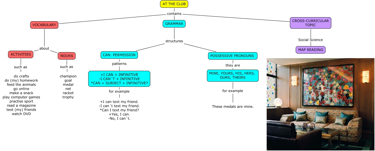 Este Cmap, tiene información relacionada con: AT THE CLUB-(Violeta), +I CAN + INFINITIVE -I CAN´T + INFINITIVE *CAN + SUBJECT + INFINITIVE? for example +I can text my friend. -I can´t text my friend. *Can I text my friend? +Yes, I can. -No, I can´t., GRAMMAR structures CAN: PERMISSION, ACTIVITIES such as do crafts do (my) homework feed the animals go online make a snack play computer games practise sport read a magazine text (my) friends watch DVD, POSSESSIVE PRONOUNS they are MINE, YOURS, HIS, HERS, OURS, THEIRS, CROSS-CURRICULAR TOPIC Social Science MAP READING, GRAMMAR structures POSSESSIVE PRONOUNS, VOCABULARY about ACTIVITIES, NOUNS such as champion goal medal net racket trophy, AT THE CLUB contains VOCABULARY, AT THE CLUB contains GRAMMAR, VOCABULARY about NOUNS, CAN: PERMISSION patterns +I CAN + INFINITIVE -I CAN´T + INFINITIVE *CAN + SUBJECT + INFINITIVE?, AT THE CLUB contains CROSS-CURRICULAR TOPIC, MINE, YOURS, HIS, HERS, OURS, THEIRS for example These medals are mine.