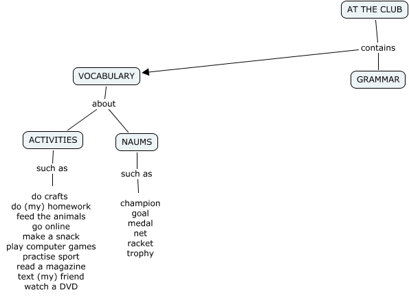 Este Cmap, tiene información relacionada con: AT THE CLUB (JOSHUA Y VICTORIA), VOCABULARY about ACTIVITIES, VOCABULARY about NAUMS, AT THE CLUB contains GRAMMAR, NAUMS such as champion goal medal net racket trophy, AT THE CLUB contains VOCABULARY, ACTIVITIES such as do crafts do (my) homework feed the animals go online make a snack play computer games practise sport read a magazine text (my) friend watch a DVD