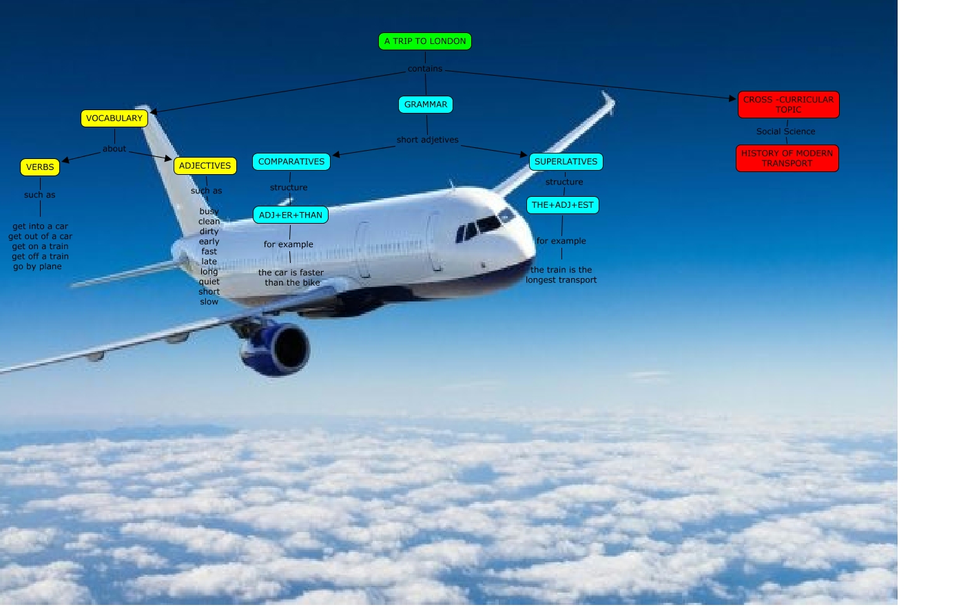 Este Cmap, tiene información relacionada con: A TRIP TO LONDON_Carmen, VOCABULARY about ADJECTIVES, ADJ+ER+THAN for example the car is faster than the bike, COMPARATIVES structure ADJ+ER+THAN, A TRIP TO LONDON contains GRAMMAR, CROSS -CURRICULAR TOPIC Social Science HISTORY OF MODERN TRANSPORT, A TRIP TO LONDON contains VOCABULARY, VERBS such as get into a car get out of a car get on a train get off a train go by plane, GRAMMAR short adjetives COMPARATIVES, SUPERLATIVES structure THE+ADJ+EST, THE+ADJ+EST for example the train is the longest transport, ADJECTIVES such as busy clean dirty early fast late long quiet short slow, GRAMMAR short adjetives SUPERLATIVES, VOCABULARY about VERBS, A TRIP TO LONDON contains CROSS -CURRICULAR TOPIC