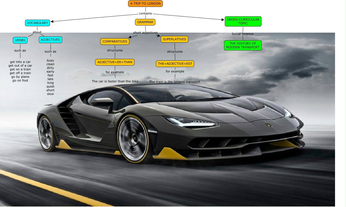 Este Cmap, tiene información relacionada con: A TRIP TO LONDON_Daniel y David, VOCABULARY about VERBS, THE+ADJECTIVE+EST for example The train is the longest transport, SUPERLATIVES structures THE+ADJECTIVE+EST, GRAMMAR short adjectives SUPERLATIVES, VOCABULARY about ADJECTIVES, VERBS such as get into a car get out of a car get on a train get off a train go by plane go on foot, A TRIP TO LONDON contains VOCABULARY, ADJECTIVES such as busy clean dirty early fast late long quiet short slow, GRAMMAR short adjectives COMPARATIVES, A TRIP TO LONDON contains GRAMMAR, ADJECTIVE+ER+THAN for example The car is faster than the bike, COMPARATIVES structures ADJECTIVE+ER+THAN, A TRIP TO LONDON contains CROSS-CURRICULAR TOPIC, CROSS-CURRICULAR TOPIC Social Science THE HISTORY OF MODERN TRANSPORT