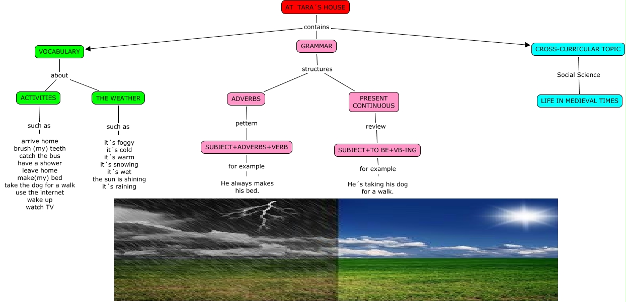 Este Cmap, tiene información relacionada con: AT TARA´S HOUSE_Amira, AT TARA´S HOUSE contains GRAMMAR, AT TARA´S HOUSE contains VOCABULARY, PRESENT CONTINUOUS review SUBJECT+TO BE+VB-ING, GRAMMAR structures PRESENT CONTINUOUS, ACTIVITIES such as arrive home brush (my) teeth catch the bus have a shower leave home make(my) bed take the dog for a walk use the internet wake up watch TV, THE WEATHER such as it´s foggy it´s cold it´s warm it´s snowing it´s wet the sun is shining it´s raining, CROSS-CURRICULAR TOPIC Social Science LIFE IN MEDIEVAL TIMES, SUBJECT+TO BE+VB-ING for example He´s taking his dog for a walk., AT TARA´S HOUSE contains CROSS-CURRICULAR TOPIC, ADVERBS pettern SUBJECT+ADVERBS+VERB, VOCABULARY about THE WEATHER, VOCABULARY about ACTIVITIES, GRAMMAR structures ADVERBS, SUBJECT+ADVERBS+VERB for example He always makes his bed.