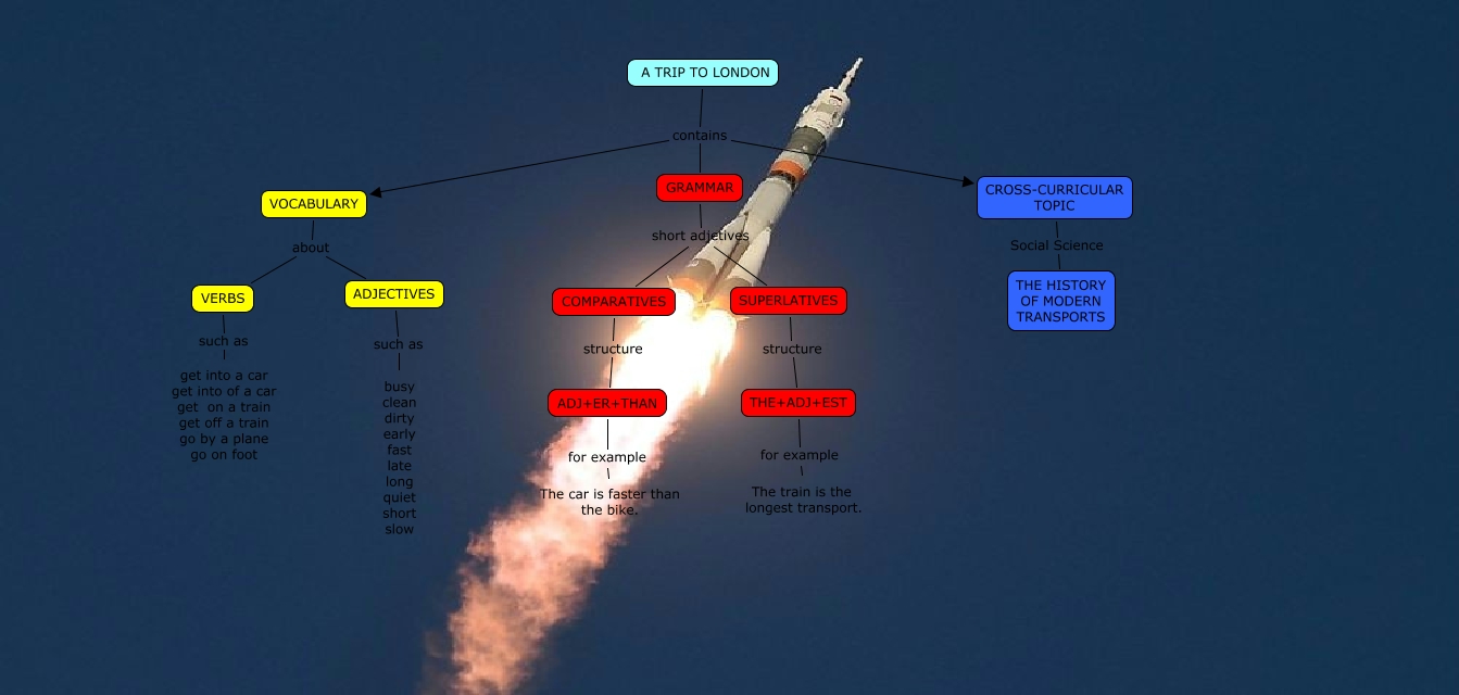 Este Cmap, tiene información relacionada con: A TRIP TO LONDON-LIDIA Y GABRIEL, ADJECTIVES such as busy clean dirty early fast late long quiet short slow, COMPARATIVES structure ADJ+ER+THAN, VOCABULARY about VERBS, CROSS-CURRICULAR TOPIC Social Science THE HISTORY OF MODERN TRANSPORTS, A TRIP TO LONDON contains GRAMMAR, ADJ+ER+THAN for example The car is faster than the bike., GRAMMAR short adjetives SUPERLATIVES, GRAMMAR short adjetives COMPARATIVES, VERBS such as get into a car get into of a car get on a train get off a train go by a plane go on foot, A TRIP TO LONDON contains VOCABULARY, VOCABULARY about ADJECTIVES, SUPERLATIVES structure THE+ADJ+EST, A TRIP TO LONDON contains CROSS-CURRICULAR TOPIC, THE+ADJ+EST for example The train is the longest transport.
