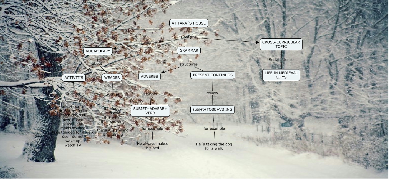 Este Cmap, tiene información relacionada con: AT TARA´S HOUSE-ALEJANDRAY ARIADNA, subjet+TOBE+VB ING for example He´s taking the dog for a walk, PRESENT CONTINUOS review subjet+TOBE+VB ING, AT TARA´S HOUSE Contains CROSS-CURRICULAR TOPIC, GRAMMAR structures ADVERBS, CROSS-CURRICULAR TOPIC Social science LIFE IN MEDIEVAL CITYS, AT TARA´S HOUSE Contains GRAMMAR, VOCABULARY about ACTIVITIS, ADVERBS patroon SUBJET+ADVERB+ VERB, SUBJET+ADVERB+ VERB for example He always makes his bed, GRAMMAR structures PRESENT CONTINUOS, ACTIVITIS Such as arrive home brush(my)teeth catch the bus have shower leave home make(my)bed take the dog for a walk use internet wake up watch TV, AT TARA´S HOUSE Contains VOCABULARY, WEADER Such as it´s foggy it´s cold it´s warm it´s snowing it´s wet the sun is shining it´s raining, VOCABULARY about WEADER