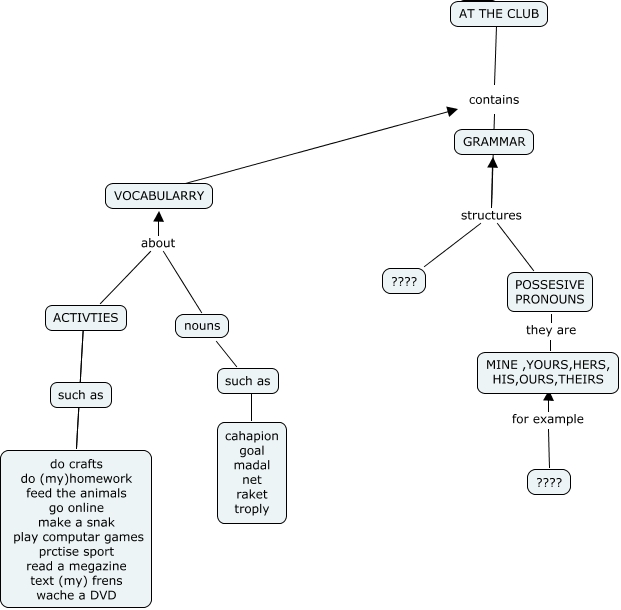 Este Cmap, tiene información relacionada con: AT THE CLUB(Victoria), ACTIVTIES about VOCABULARRY, nouns ???? such as, ACTIVTIES about nouns, VOCABULARRY ???? contains, MINE ,YOURS,HERS, HIS,OURS,THEIRS for example ????, POSSESIVE PRONOUNS they are MINE ,YOURS,HERS, HIS,OURS,THEIRS, ACTIVTIES ???? do crafts do (my)homework feed the animals go online make a snak play computar games prctise sport read a megazine text (my) frens wache a DVD, MINE ,YOURS,HERS, HIS,OURS,THEIRS for example ????, contains structures POSSESIVE PRONOUNS, ACTIVTIES ???? do crafts do (my)homework feed the animals go online make a snak play computar games prctise sport read a megazine text (my) frens wache a DVD, AT THE CLUB contains, contains structures GRAMMAR, contains structures ????, such as ???? cahapion goal madal net raket troply