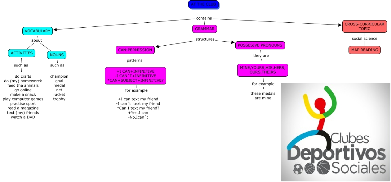Este Cmap, tiene información relacionada con: AT THE CLUB Lula,Moisés, NOUNS such as champion goal medal net racket trophy, GRAMMAR structures POSSESIVE PRONOUNS, GRAMMAR structures CAN:PERMISSION, MINE,YOURS,HIS,HERS, OURS,THEIRS for example these medals are mine, ACTIVITIES such as do crafts do (my) homeworck feed the animals go online make a snack play computer games practise sport read a magazine text (my) friends watch a DVD, VOCABULARY about NOUNS, +I CAN+INFINITIVE -I CAN´T+INFINITIVE *CAN+SUBJECT+INFINITIVE? for example +I can text my friend -I can´t text my friend *Can I text my friend? +Yes,I can -No,Ican´t, CROSS-CURRICULAR TOPIC social science MAP READING, AT THE CLUB contains VOCABULARY, CAN:PERMISSION patterns +I CAN+INFINITIVE -I CAN´T+INFINITIVE *CAN+SUBJECT+INFINITIVE?, AT THE CLUB contains CROSS-CURRICULAR TOPIC, POSSESIVE PRONOUNS they are MINE,YOURS,HIS,HERS, OURS,THEIRS, AT THE CLUB contains GRAMMAR, VOCABULARY about ACTIVITIES